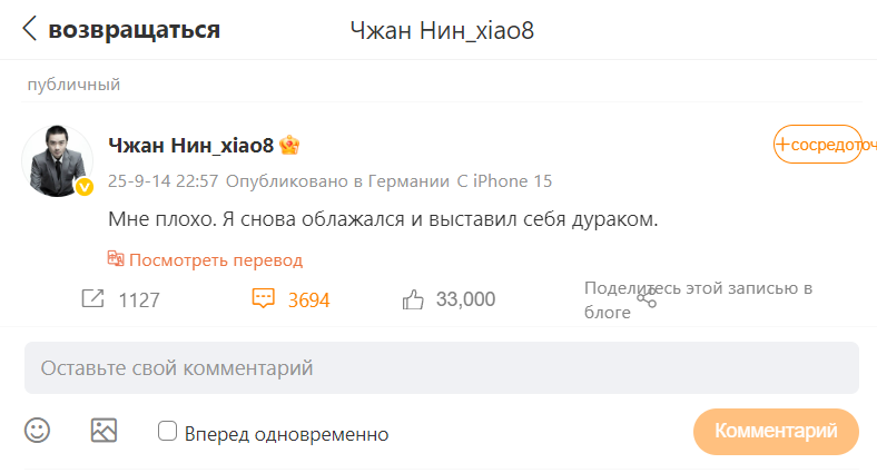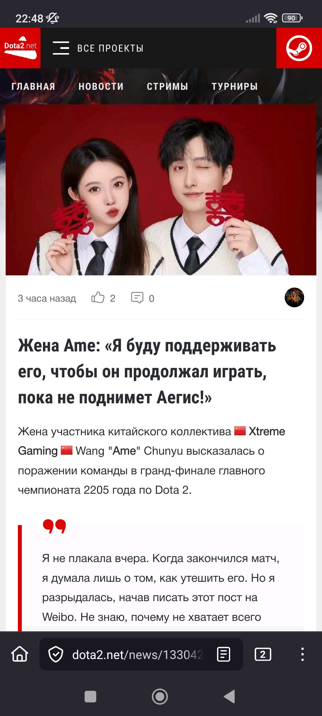 Я не плакала вчера. Когда закончился матч, я думала лишь о том, как утешить его. Но я разрыдалась, начав писать этот пост на Weibo. Не знаю, почему не хватает всего одного шага – дело в удаче или чем-то ещё? Я уверена, у него еще будет шанс! Дота всегда была важнейшей частью его жизни, которой он отдавал всю энергию. После его возвращения на профессиональную сцену у нас не было свадьбы, медового месяца и совместных путешествий. Он не был со мной в нашу годовщину, в праздники и даже в мой день рождения, но это никогда меня не расстраивало. Даже наоборот, я обожаю смотреть, как он борется за то, что очень любит. Хочу отдельно поблагодарить его тиммейтов, которые боролись плечом к плечу с ним. Нам еще многое предстоит пройти вместе, и я верю, что это поражение не сломит его! Пусть у нас всегда будут силы начать все заново! Увидимся в следующем году.