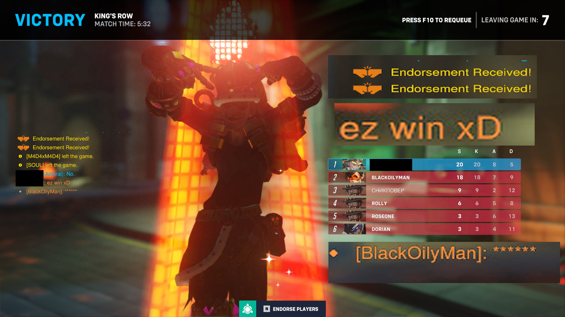 Я не репорчу за нестандартные пики, если ты полезен. Саппорты, которые были втором и третьем слоте (я мерсимейн) получают "гуд тиммейт" эндорс. Танки, которые хорошо прикрывали меня или перевернули ключевой файт, получают "шот коллер" эндорс. Дебилоиды на ДПС не получают эндорс никогда. Если ты был сильным игроком в противоположной команде, но тиммейты тебе заруинили, и при этом у меня есть лишний эндорс, то я даю тебе "спортсменшип". Если мы проиграли, то эндорс не получает никто!
