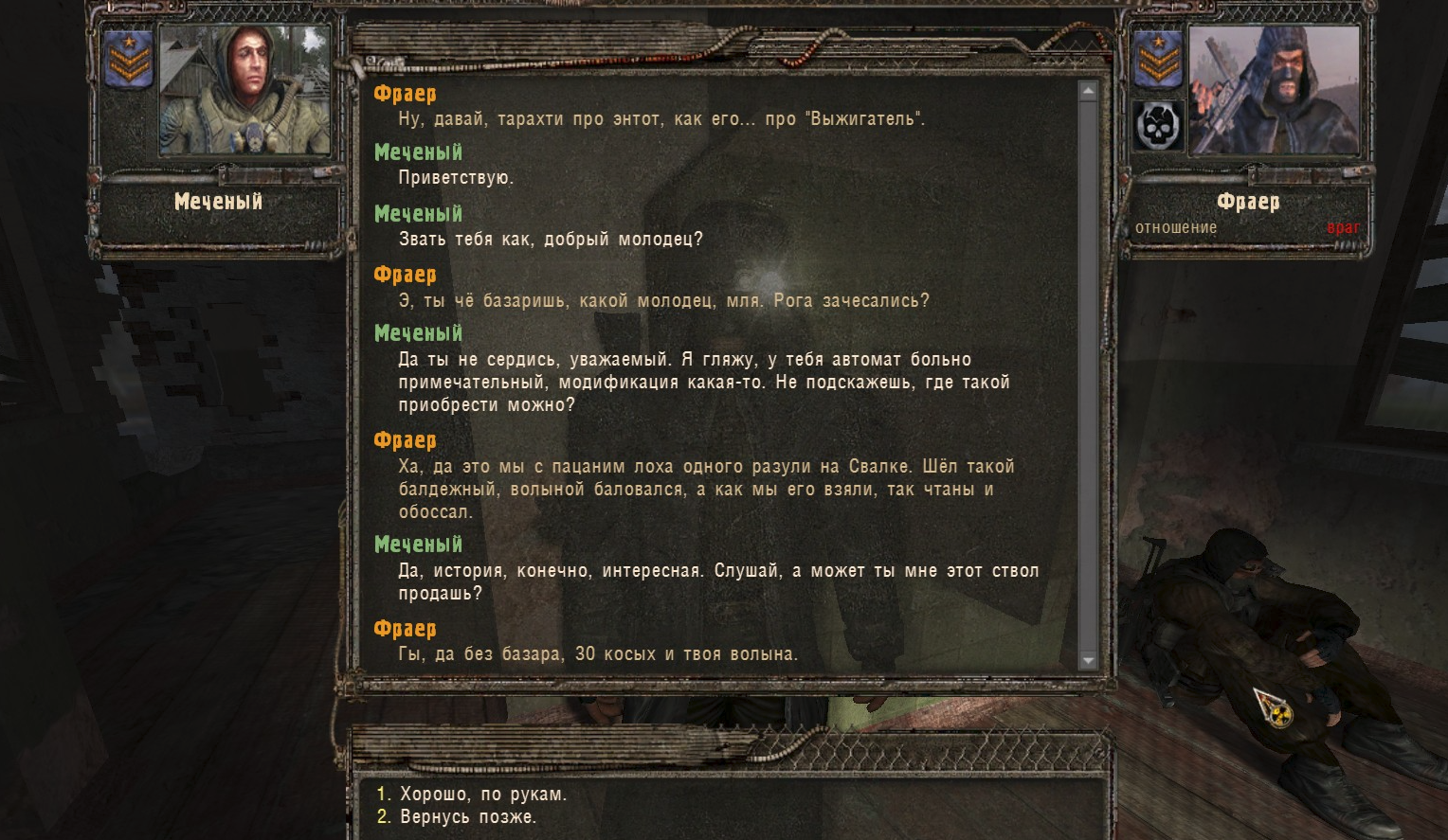 Помните, как в пидорасовских модах было: чел с бабкой базарят в подвалах на свалке, а тот достаёт уберпукич драбавик и просто нахуй, ёпта, расхуяривает бабку в пизду, ёпта, блять, нахуй, сука. Во клоунада была конечно. Зато сталкер типа, ага.