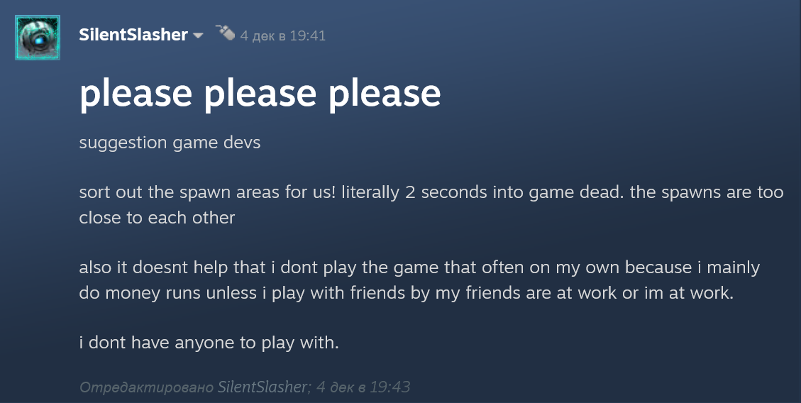 Типа, МОЖЕТ БЫТЬ игра и имела бы больше жизни и шире комунити, если бы немцы додумались сделать дезматч, как Тарков Арену в своё время. Всё на что хватило это подрезать основной режим до баунти клэш, где опять надо за награду пиздиться. Причем этот дезматч можно продать повторно и аноны схавают, как и я тоже. Но имеем то что имеем, разрабам похуй+поебать, пока это ебанутое сообщество говноедов донатит на скинчики.
