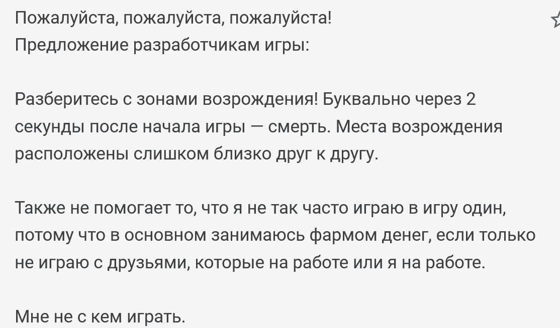Причем, блять, решение очевидное - сделать отдельно онли тройки и отдельно соло/дуо (как хант и задумывался). У меня тут противоположное мнение например. Мне сольники геймплей никак не портят. За 300 часов в игре я был и на 4 и на 6 звездах, не ощутил какого то прям дискомфорта натыкаясь на сольников. Я например раньше любил в соло играть против троек, зачем у меня забирать такую возможность? Всем угодить не получиться, если начать делать еще больше разделений в режиме то и онлайна не хватит. Был бы он намного больше то такое бы еще прокатило. Вот некр за чанки был по ощущениям намного неприятнее, сейчас он выглядит так себе, как будто если ты встал то это либо большой риск, либо если встал без проблем то это уже ошибка пачки которая тебя убила.