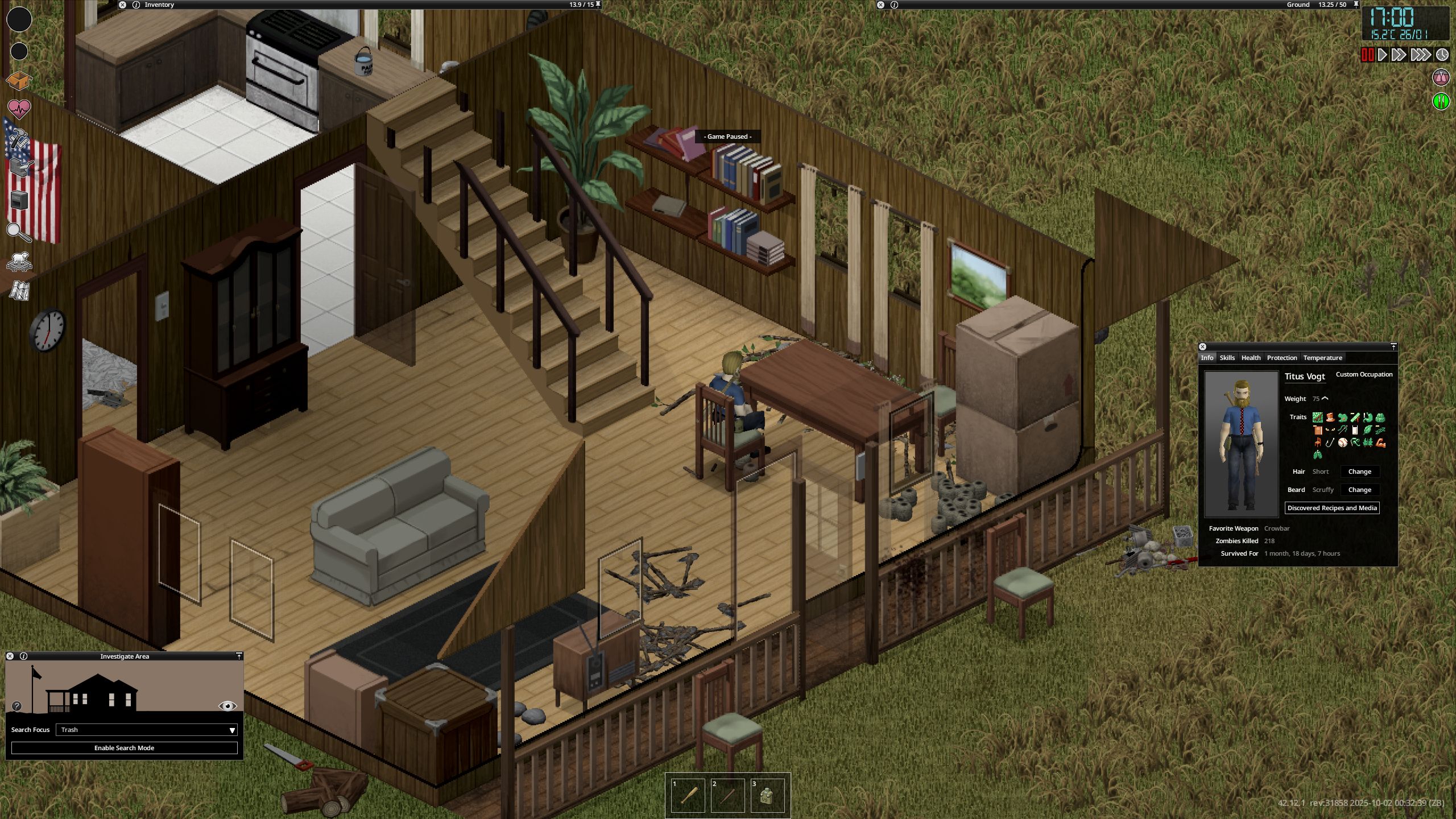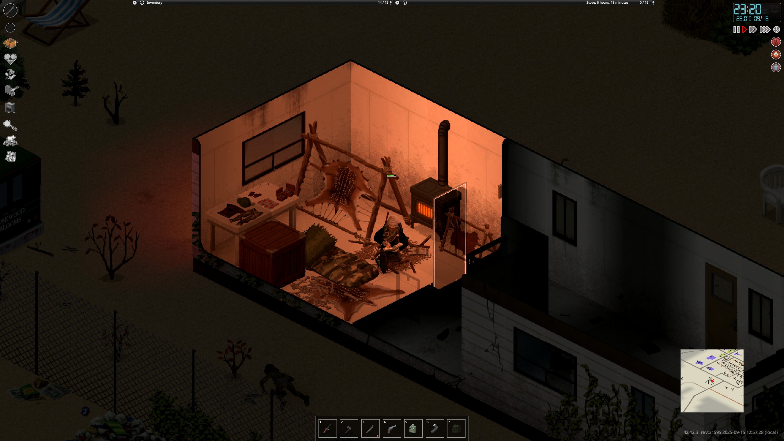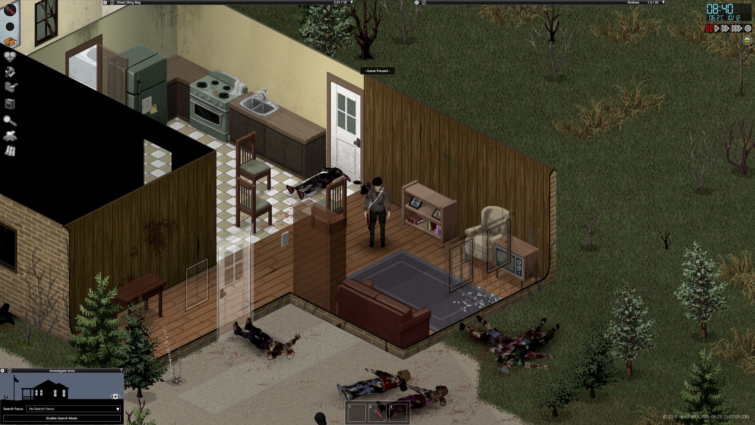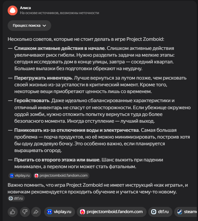 Ясно В переводчик сами прогоните NEW • Reordered hit location damage calculation to occur after body part selection by ballistic • Ranged weapons can now use damage modifiers specific to each body part. • Fixed a shotgun aiming bug. Zombies were dodging the projectiles. When aiming at a specific body part, the other projectiles mysteriously disappeared. Now all projectiles are calculated correctly— every zombie gets what it deserves • These changes impact how shotguns work and feel in the game. • Added cone of vision opacity slider in performance settings. • Updated the cone of vision to use external square lighting when it is brighter than the daylight value, allowing the player to benefit from streetlights and other sources at dawn, dusk, and night. • Updated the lighting system so that rooms behind closed doors are completely dark. • Added more tiles for Breakable Metal Fences. • While resting, the Endurance moodlet now functions as a progress indicator. • Updated pathfinding to allow players to plan paths over climbable walls during "Walk to when wall can be climbed." • Added models, textures and model keys for muzzle flashes. • Players can store bodies in the trunk or in the seats of the vehicle. • Added "required items" and "sort by name" options to crafting Uls. "Sort by name" has been renamed to "Alphabetical (A-Z)". • Cigarettes can be smoked directly from the pack without having to remove them first. • Liquid containers that require opening for consumption will now have a "Drink" option (if the player can open them). Selecting this will execute the opening recipe before drinking. The context menu option is now "Open and Drink" instead of just "Drink." • Canned food that needs to be opened for consumption will now have an "Open and Eat" option, which will run the opening recipe before the eating action. • Similar to double-clicking on food, which causes the character to eat it, now double-clicking on pills and consumables like chewing tobacco will cause the character to consume them. This does not apply to rat poison (to prevent accidental death). • Double-clicking on drinks makes the character drink, opening the container if necessary. • Double-clicking on water makes the character drink if he is thirsty. • Improved automatic highlighting of the first recipe in the crafting search. Now only the recipe selected by the player is highlighted. • Added player-visible poisoning/contamination rating to prevent players from drinking double-clicked liquids if they are poisoned/contaminated. • Added SHIFT + CLICK in the list of available ingredients (Windows style selection). • Added CTRL + CLICK on the header to select everything inside it. • Crafting/building menus now close when the character moves. Added a lock button to the Crafting and Building windows to prevent them from automatically closing when walking. • Crafting/building/entity interfaces now save and restore size/position between loads. • Items marked as unwanted will be specific (individual media or books) and not entire categories. • VHS tapes that have already been watched will have "(Watched) in their name, CDs that have been listened to will have "(Listened). • When trying to light a fire with a carved plank without fuel, the option will appear in error color with a hint explaining that it needs fuel. • An exhausted player trying to light a fire with a carved plank will see an explicit hint and an error-colored option instead of the missing option. • Worms in compost bins now reproduce in winter if the compost bin is considered "indoor." • Individual inventory items can be marked as unusable in crafting recipes. crafting/building (and this tag can be removed). • Added title bar buttons to the loot window footer. • Added contextual loot buttons to remove fire pits and drop bodies on unlit fire pits. • Added filled models for Ceramic Bowl, Glass Jar and Cup. • Improved tooltips and list of possible liquids in the manual crafting tab. • Low-level cookbooks added to kitchen loot • New "Crafty" trait: 30% XP bonus to Crafting skills only. Exclusive to "Fast Learner" and "Slow Learner", costs 3 points. • Added option to browse recipes that an item can be used for by right-clicking on it. • Players can rename containers on tile objects. • Added "possible ingredients" feature to the Construction Menu. • Color bars in item tooltips now use "good" or "bad" color according to benefit or penalty (running speed, combat, discomfort, etc.). • Inventory items that affect Stamina, Fatigue, or Stress when consumed now use colored bars instead of numbers. • Items that affect Vision or Hearing when used show colored bars (bad or good), not color scales. • Hay can now be removed from hay blocks. • Added text "No recipes available if there are no recipes. • Slight optimization when evaluating whether an inventory item is a revenue input. • More rigorous assessment of whether a rubble tile can be "simply collected". • Added filled templates for Fountain and Plastic Cups. • Added recipe for making mirror. • Cookable foods show cooking time in the tooltip if the player has a 5+ Cooking skill. • When viewing the trunk inventory from outside the vehicle, there will be a top button to close the trunk. If the player has the key, they can also close and lock it. • Animal corpses now appear highlighted in the Animal Designation Zone Ul. • Cake Pan can now store liquids. • Added a crafted version of the Glass Jar and updated the recipe to craft it instead of the looted version. • Added background to radial menu text for better readability. • Microwave/oven buttons renamed from "Cancel" to "Close". • Controller focus set to profession list when opening character creation. • Controller focus set to character panel when opening creation screen. • Added visual transition when using left shoulder to switch Ul 