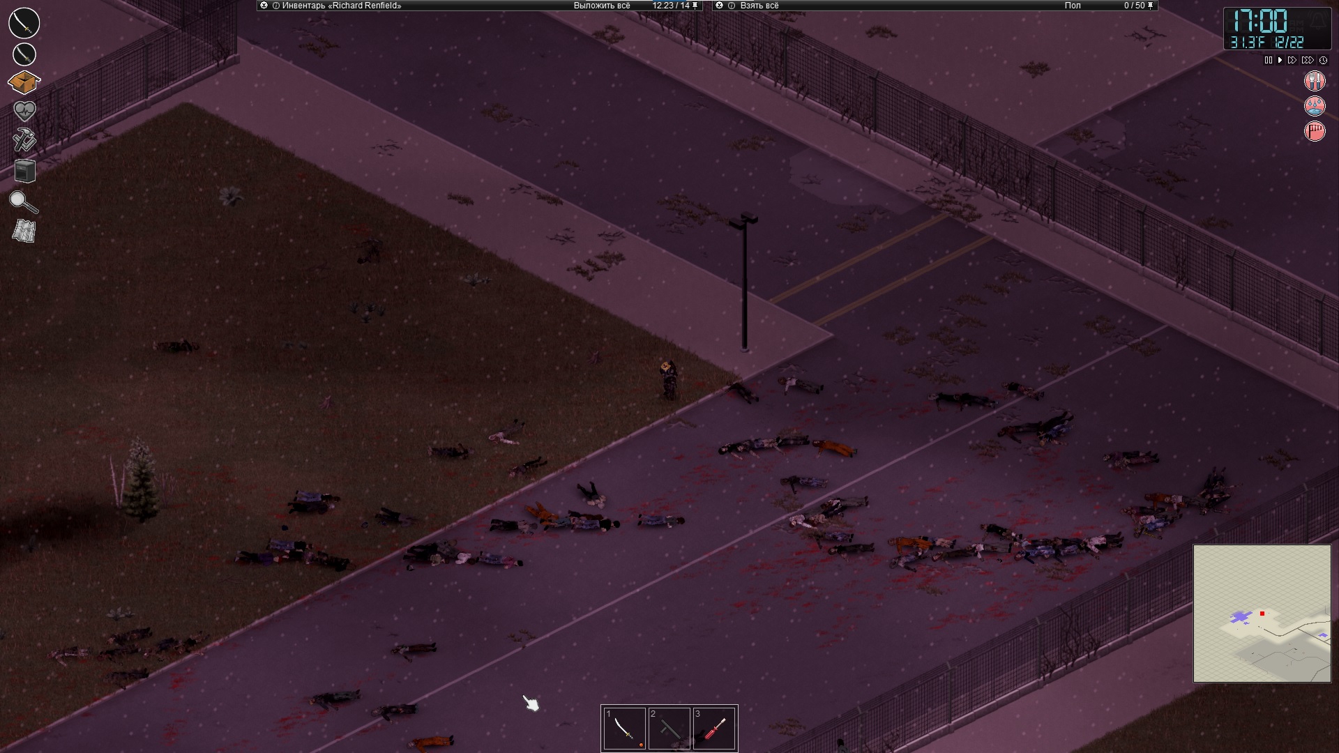 Бесконечный штурм тюрячки, серия N-десятая. После выноса кучи патронов и винтовок из оружейки, я решил проверить и главное здание. Как я и думал, внутри их тоже дохера, и соваться внутрь будет самоубийством. Достаточно было одного выстрела из дробовика, чтоб вся нечисть начала выползать из здания. Результат как всегда превзошел все ожидания, их опять на глаз под сотку (Для олдов это может и кажется немного, но я сычую в давно зачищенном Роузвуде, и таких толп с первых недель игры не видел) набралось наверное, пришлось последних дорезать уже катаной, от входа они меня опять отогнали довольно далеко. Жалко, что скриншоты в зомбоиде нормально не сделать, так что приходится снимать всё уже после побоища.