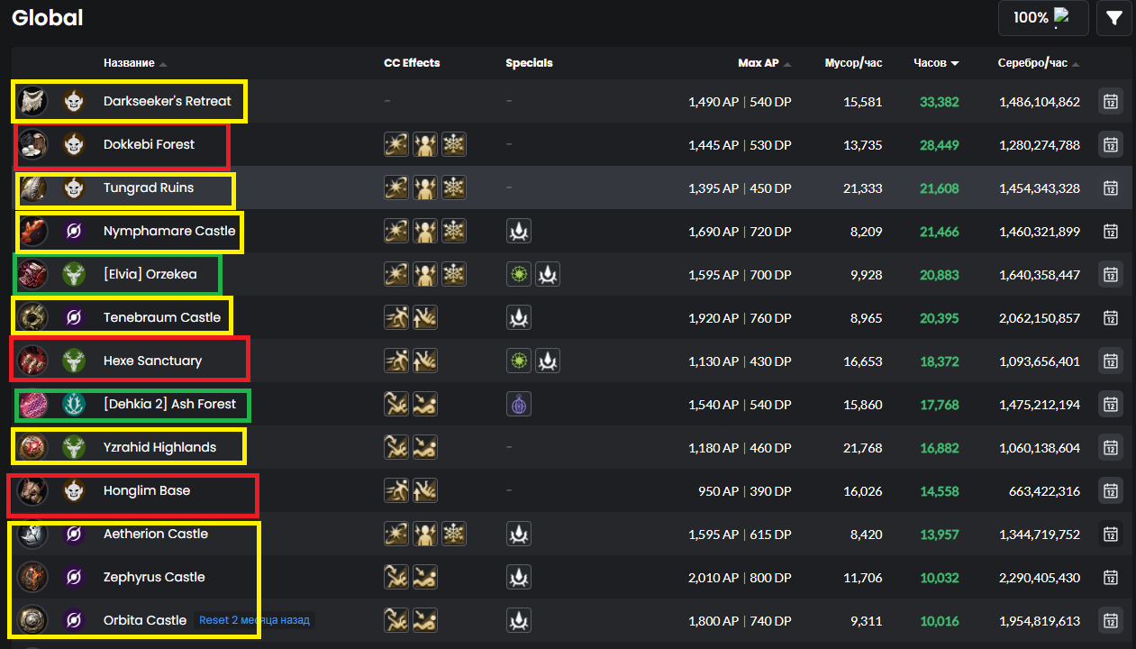 Теперь к нулёвкам, почему они дорожают? Предлагаю опять таки разобрать, откуда они берутся, основных источников всего два: споты и еженедельный калтент. Храмы, разломы, гладиус - тут всё как и было, дают как давали Со спотами, увы, всё не так однозначно, предлагаю взглянуть на самые популярные споты за последние три месяца. На пике 2 я поделил споты на три категории: красная - не дропаются деборики, жёлтая - дропаются, но есть один нюанс, зелёная - долбит нормально. С красной категорией всё понятно, с зелёной тоже, а вот жёлтая уже поинтереснее. Улукита даёт деборики, но даёт только кольца, и то в виде проходки (т.е. очень ненадёжно). Идания, в которую потихонечку перетягиваются фармилы, действительно выдаёт все виды деборик. Но выдаёт их редко, раз в 2-3 часа. Вывод из всего вышеперечисленного сделаешь сам, взглянув на график цен на нулёвки.