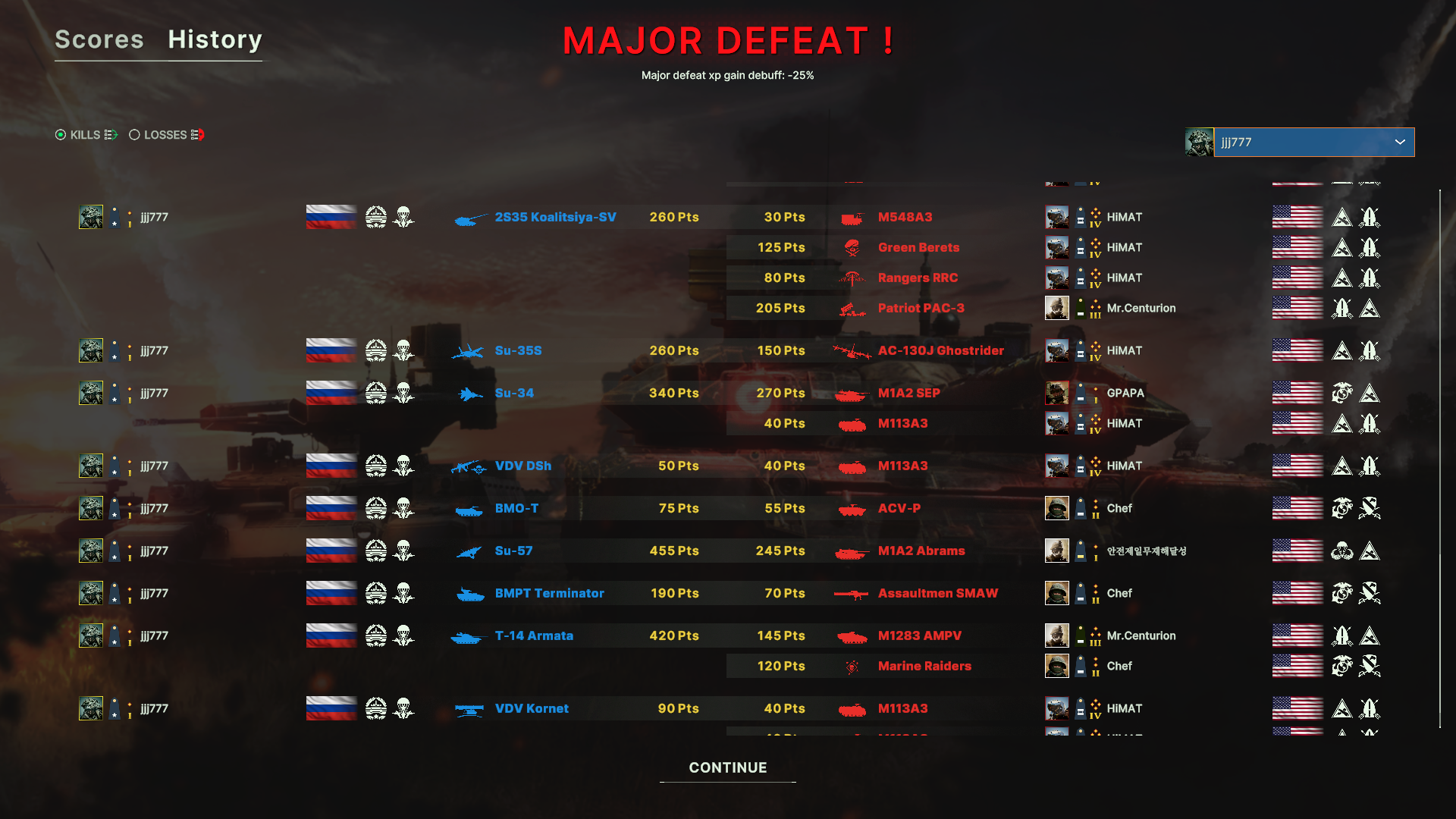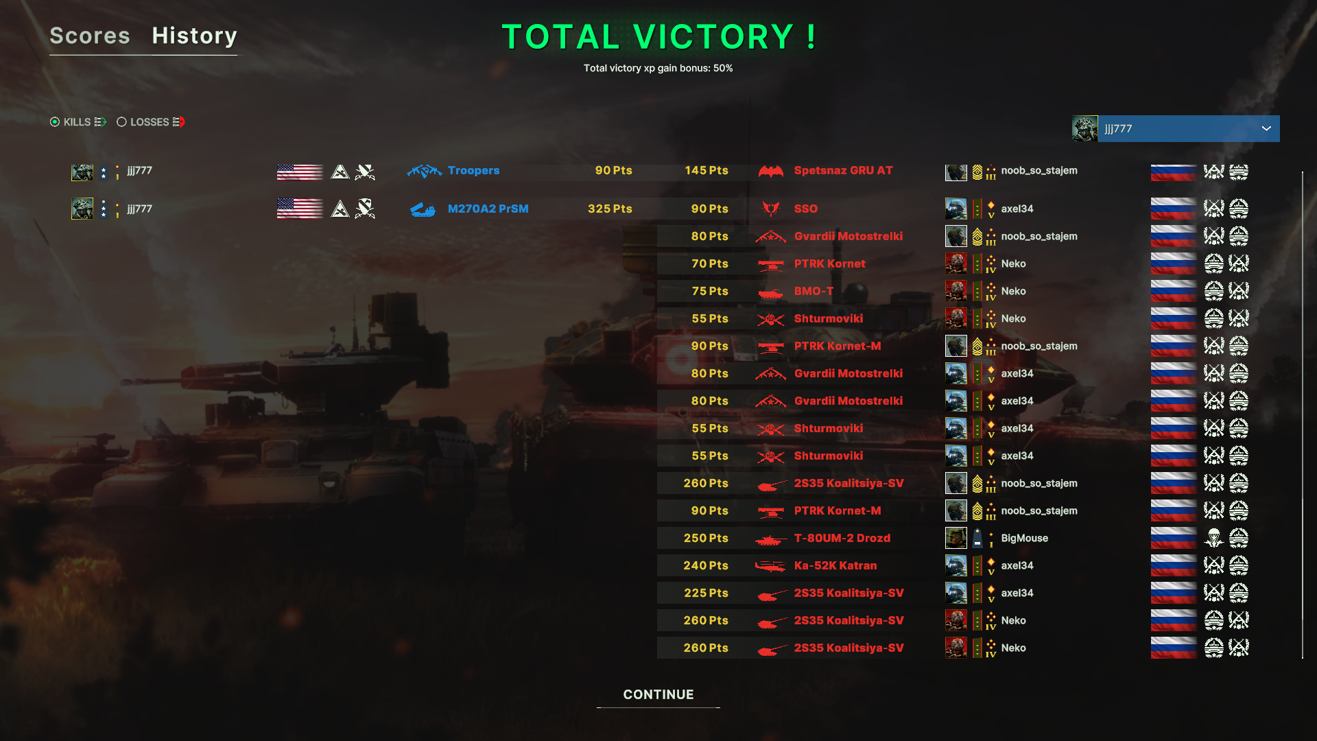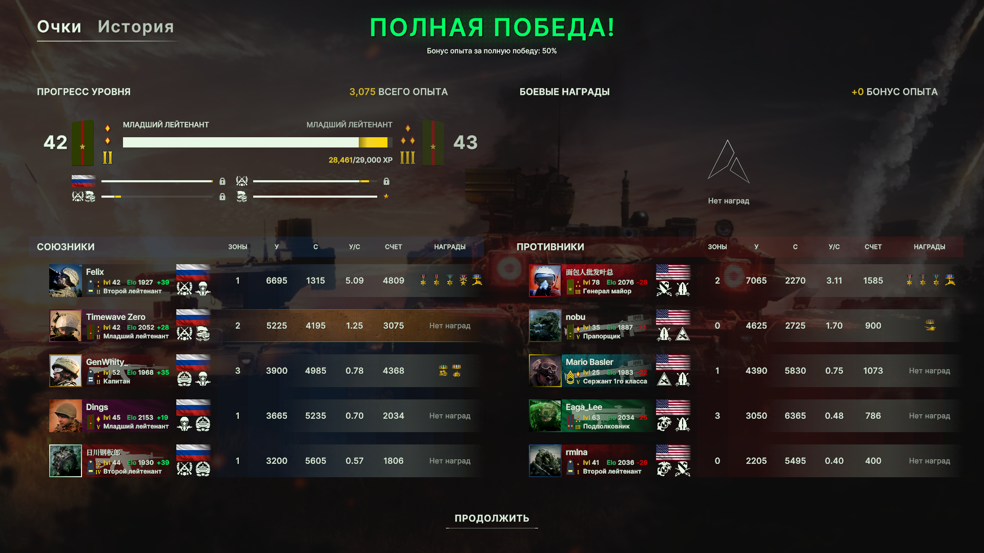 Впервые так много наубивал наверно, видимо карта крохотная, единственная с островом. Интересный мачтмайкинг с челиком 1900 vs 800, наверно тащил кого-то наверх, но играл он отвратно кста, спамил самолёты и арту, несколько раз выезжал по земле и при этом такое кд. Меня сминали в ноль один раз в середине игры, оставалось пара суплаев, снайперов и коалиция, горел sudden death, был во уверен в поражении.