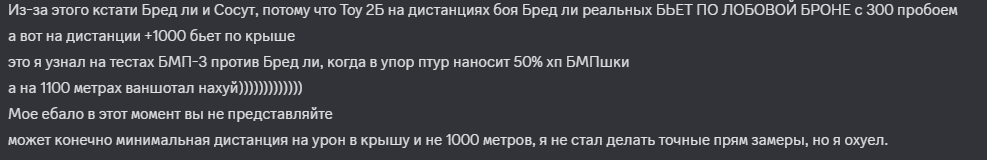 >>50255766 160 очков чтобы что блять? ДРОПНУТЬСЯ НА БАРБАРИС В ЛЕСУ? Так барбарис по лесу никто не катает. Но я ради интереса даже щас проверю кстати. Я ваще не помню когда последний раз были бои в лесу, лес ебут бомбами, артой и крылатками, там нихуя не живет дольше пары минут. Что раково кстати. >>50255769 Чтобы точно не промазать. Они к сожалению требуют очень близкого попадания чтобы убить танк.
