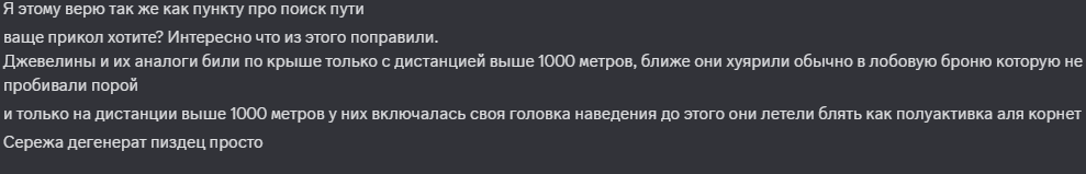 >>50255678 >Еще раз. Мне твои стори с 800 ело неинтересны. Я тебя так то ебал. Ты еще на лаги ныл. Протащенка лоббийная. >с клоуз рейнджерами Эх щас бы еще один отряд что в соляного может удержать квартал против почти любой (кроме самой жесткой антипех пехоты) + БМП/БТР разменивать на дроч в лесу... >>50255689 Ну да, в лесу сразу видно врага так то, и потом смотришь как бомбер оформил стрик на 400-600 очков пехоты + бмпшек. >>50255688 >мямдымы