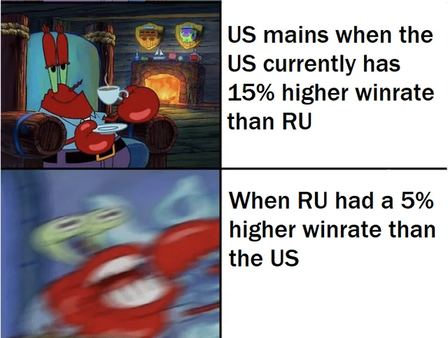 >>50421535 >Отсюда у меня вопрос, что подорвет щас жопы треда - может быть игроки РФ не на своих ЭЛО, из-за этого и такая разница в винрейте? Ладно разница не должна быть такой огромной но одна из причин явно то что средний игрок РФ на 200-300 пунктов выше чем должен быть Я хз, если в соло играть, то там все тупо от рандома зависит, тебя мотыляет по +500/-500 эло туда-сюда. У меня вот 10 каток подряд просто челы ливали/сдавались, когда победить еще могли, я сразу на -300 за день улетел. Потом 3 раза на 2к пиво наткнулся, которое абрамсами и шорадами давит и +150 сразу. Ты как не играй, за пятерых или даже за троих не выйдет, у тебя тупо лимита юнитов не хватит. Вот типа я сейчас 3-4 точки удерживал по центру, а хуй мне. Я типо должен не только как ебанутый все двигать и уворачиваться от бомбежки, но и на фланги сам летать успевать?