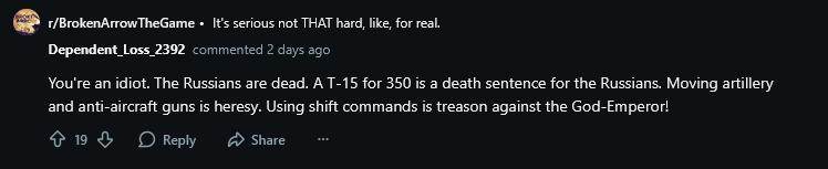 ТО есть блять, для меня абсурдна мысль делать спец антипех отряды когда пехота сосет буквально у всего и используется в суицид ранах аля БТФ3 с 2мя отрядами морпехов чтобы забрать танк...