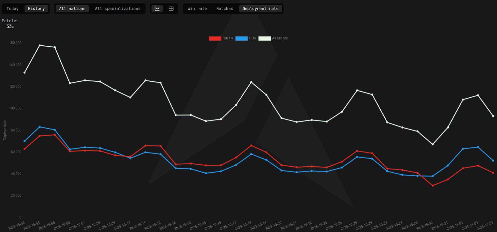 Сейчас 70 игр и 1100, кд чуть больше 1, очень сильно помог пост антона про деку ВДВ+механ, хотя сама дека не зашла по ряду причин (показалась слабой пехота в отличии от моряка и мотора, не понравились мальки, не зашли популярные дорогие конфиги самолётов вроде су-57, тогда как прёт от су-33 с ракетками s25 за 205, простых дешевых кластерников, фабовозок и иногда торнадо). Играю мало и не сказать, что страдаю за Ру. Больше проблем за Юсу было до патча, но тогда и навыков сильно меньше было.