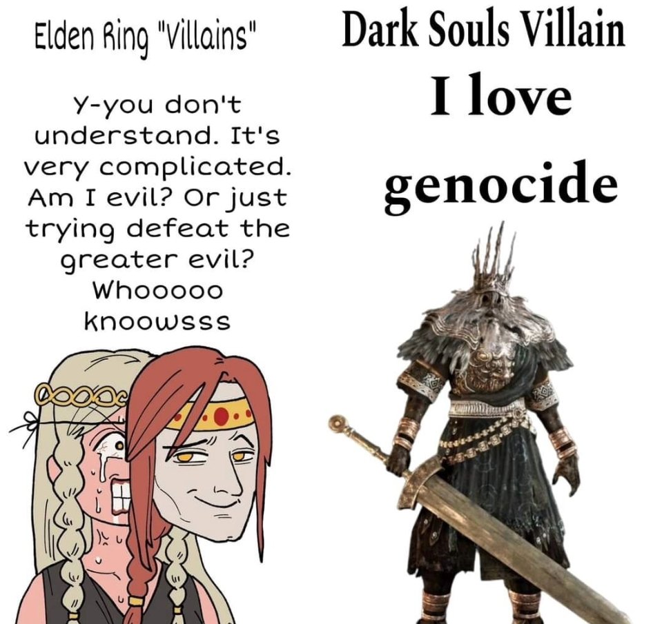 >>50344624 Хз, на это по большому счёту всё равно, понятно дело что условности это всё. Хотя вот сейчас длс пробую и некоторые вещи действительно прям отдают странностью. Например, шлем солдата мессмера с йоба гравировкой. Понятно, что в эр у всех эта йоба гравировка брони и проч, которая ирл редко когда у королей была. Но тех же стражей древа всё плюс минус норм элита из элит и тп. Но простые солдаты? У которых в описании перчаток что они все уже ржавые и покрыты грязью (что тоже тот ещё бред лол как это вообще возможно блять) и у которых из брони кольчуга хиленькая с пластиной по центру... И у каждого на шлеме ебать золотом выгравировано дерево. Тупа. Ну и по мелочи порой возникают типо вот мост атмосферно гримдарково на кольях люди. Но идёшь чуть дальше и их просто сотни если не тысячи. Так мрачно что уже нелепо. Особенно если учесть что солдат там штук пятнадцать, но это условности опять же. Или Реллана. Почему арена с ней настолько нелепая. Особенно если сравнивать с ареной Лоретты, где по сути то же самое но там это не выглядит бредово ибо особняк магический плюс заброшенный плюс босс проекция. А тут вы хотите сказать что живой человек сидит на этом стульчике перед огромной лужей? Пиздец. Лучше бы этого стула там вообще не было. Ещё и сразу же за ней выход из ворот на поляну блять. Что это за замок такой идиотский? Где типо тронный зал или что это куда ты поднимаешься и поднимаешься с одной стороны... И самая высокая точка находится на уровне полей каких-то с другой...