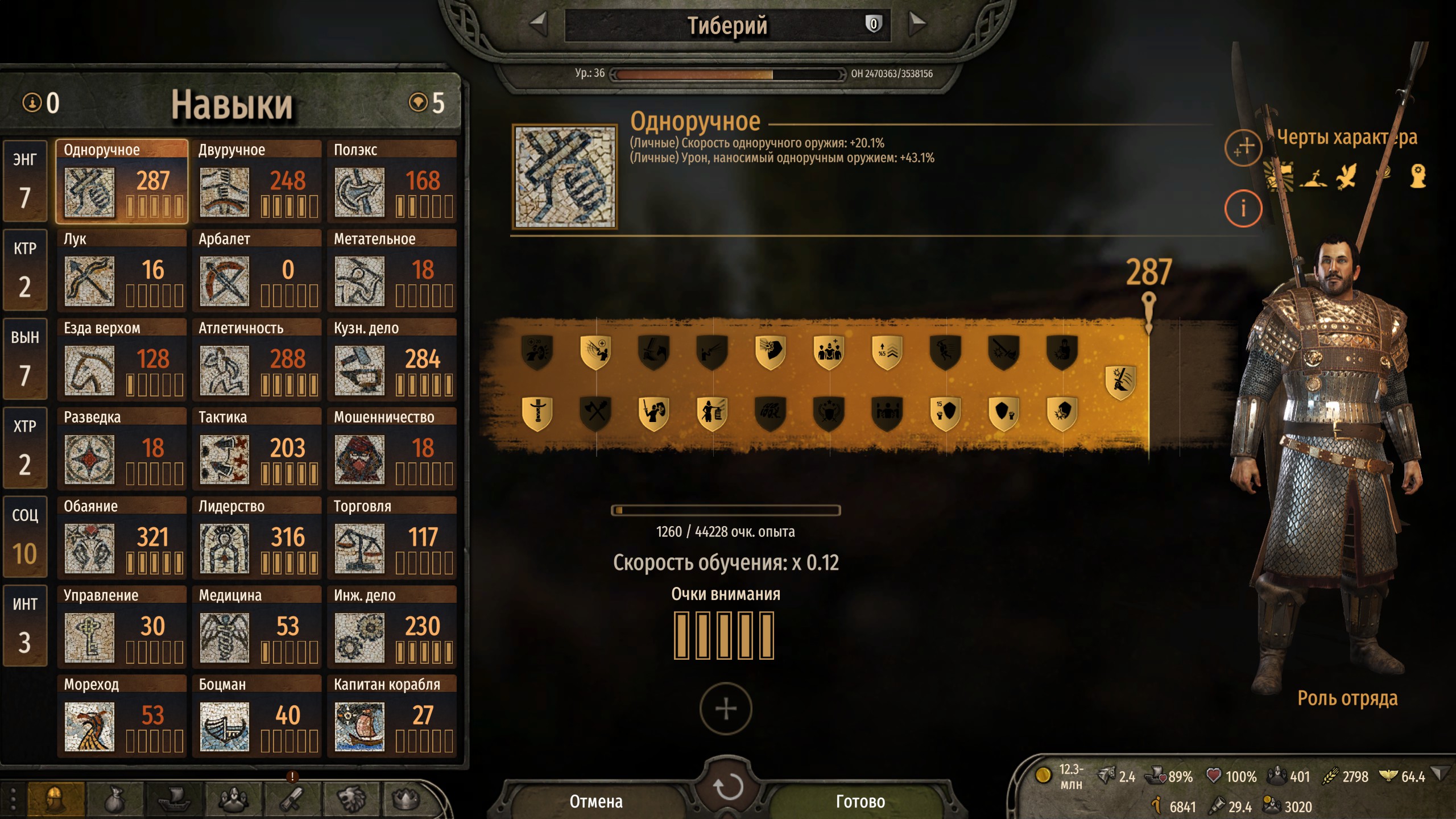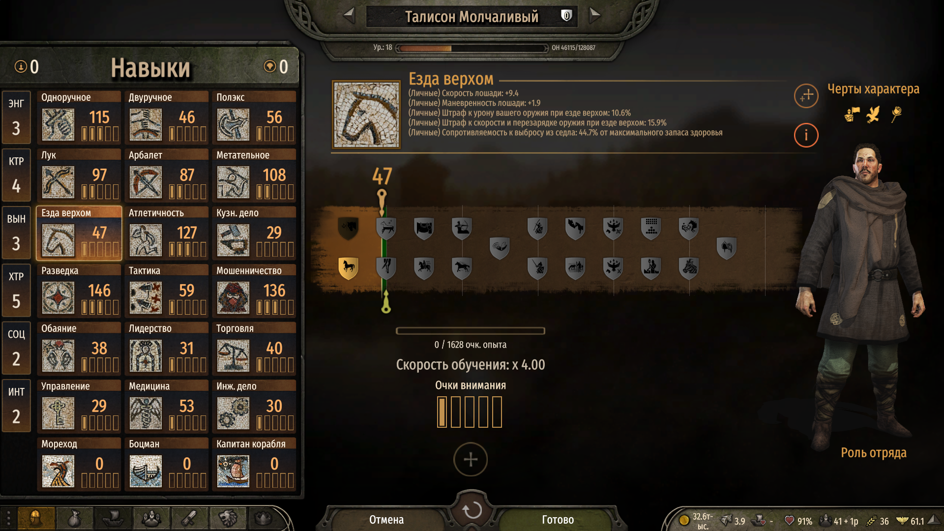 Инвентарь в Mount&Blade нужно качать всегда, на максимум возможного, особенно торговцу, потому что места в инвентаре всегда не хватает, даже с раскачкой на 10. Очень обидно упускать возможность закупиться в норвежских деревнях дармовым железом, смолой и мыльным камнем, просто потому что инвентарь забит цацками, вином и солью из Фризии, янтарем и мехами из Дании и смолой из Тунсберга не считая твоего личного барахла.