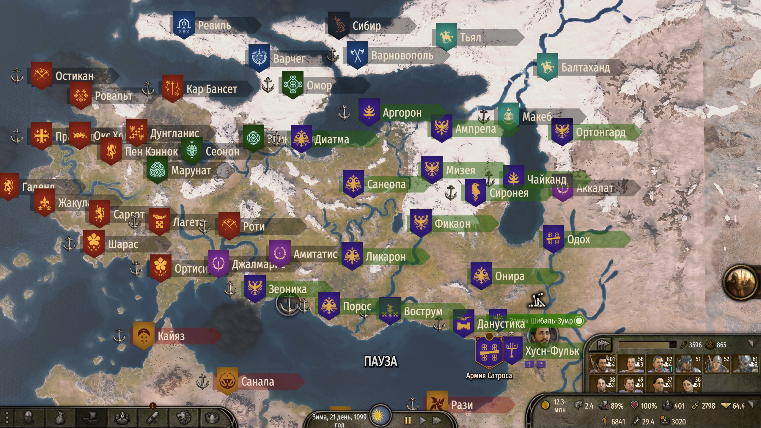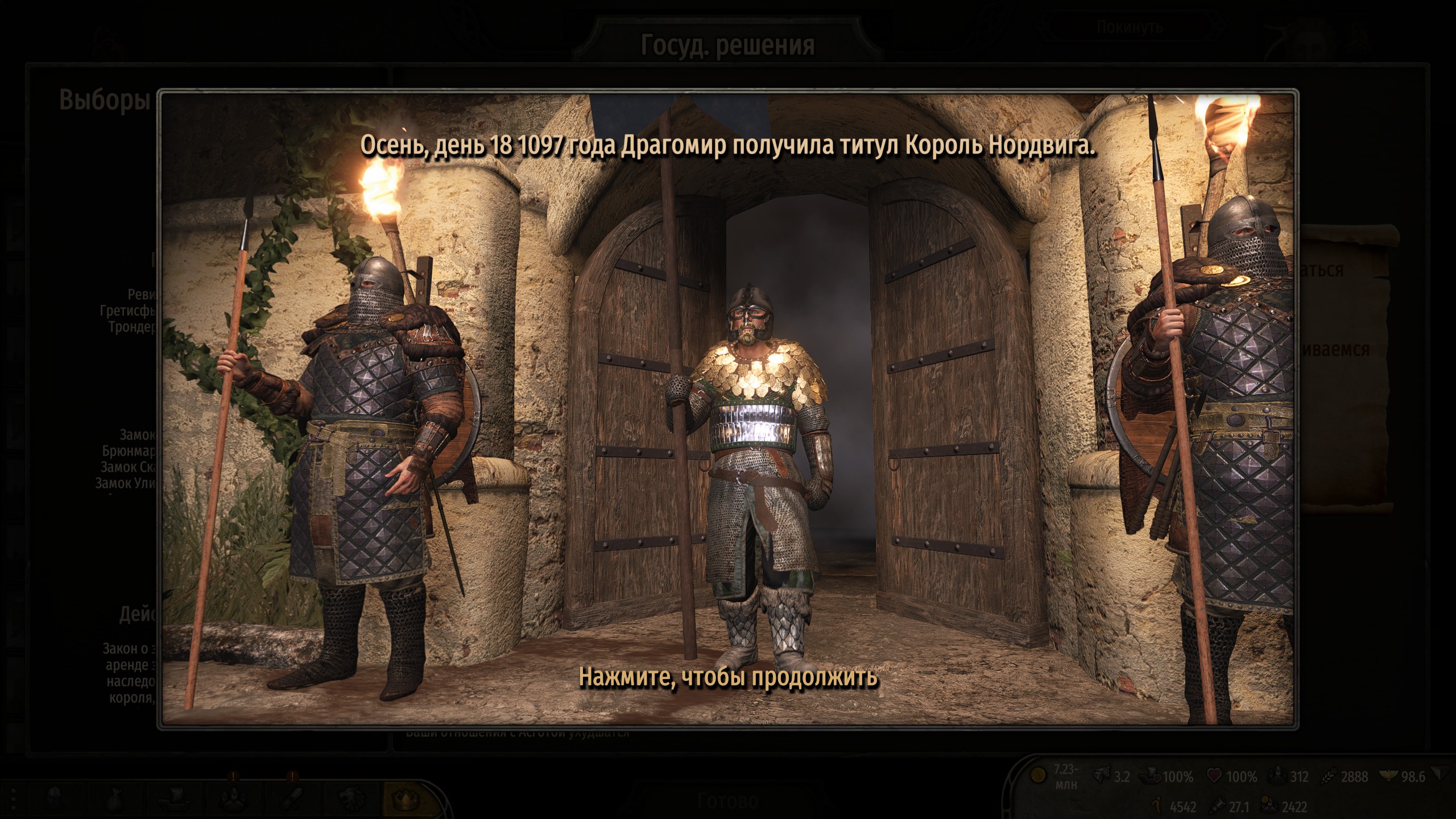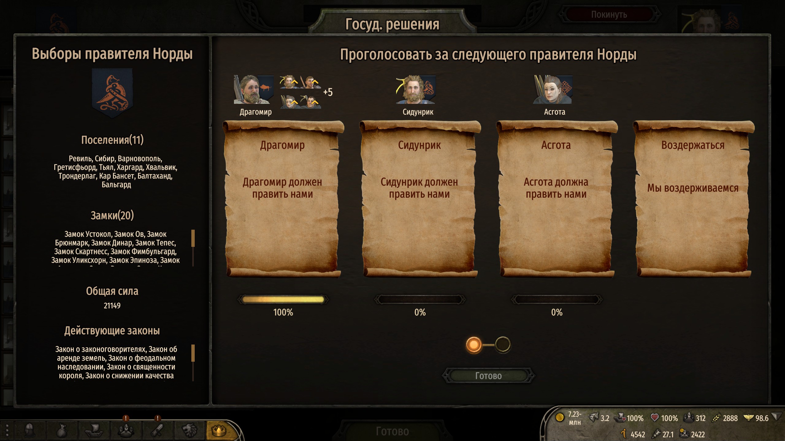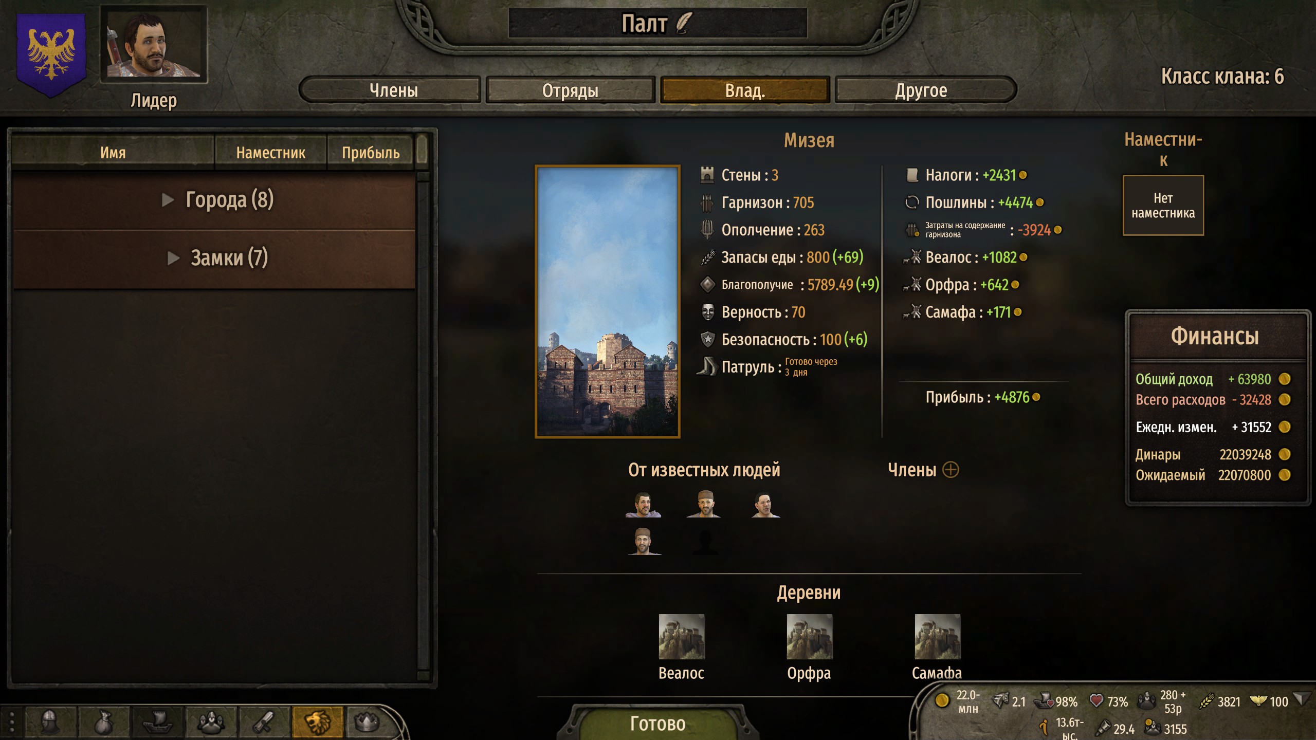 Ух, смог преодолеть первый, самый сложный этап королевства. Теперь хватает кланов и отрядов, чтобы и без меня защищать деревни от разграбления (а то это сразу приводит к нулю продовольствия в городах и мощное падение благосостояния) и даже захватывать новые земли (замок у хузаитов с всего двумя сотнями защитников, да, но зато сами!).