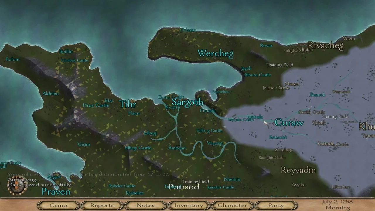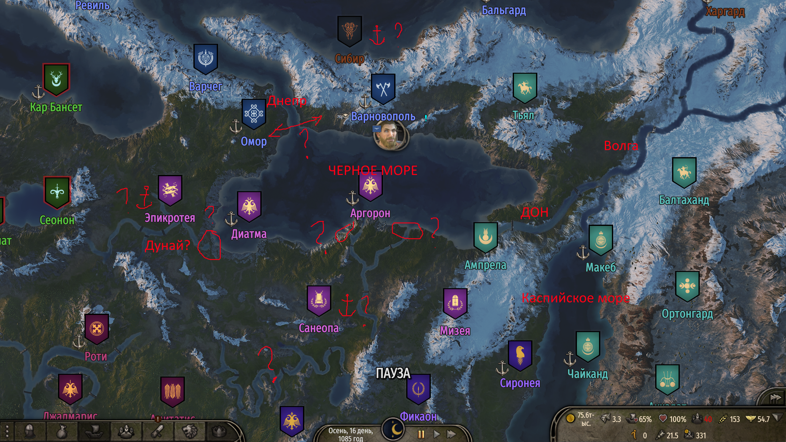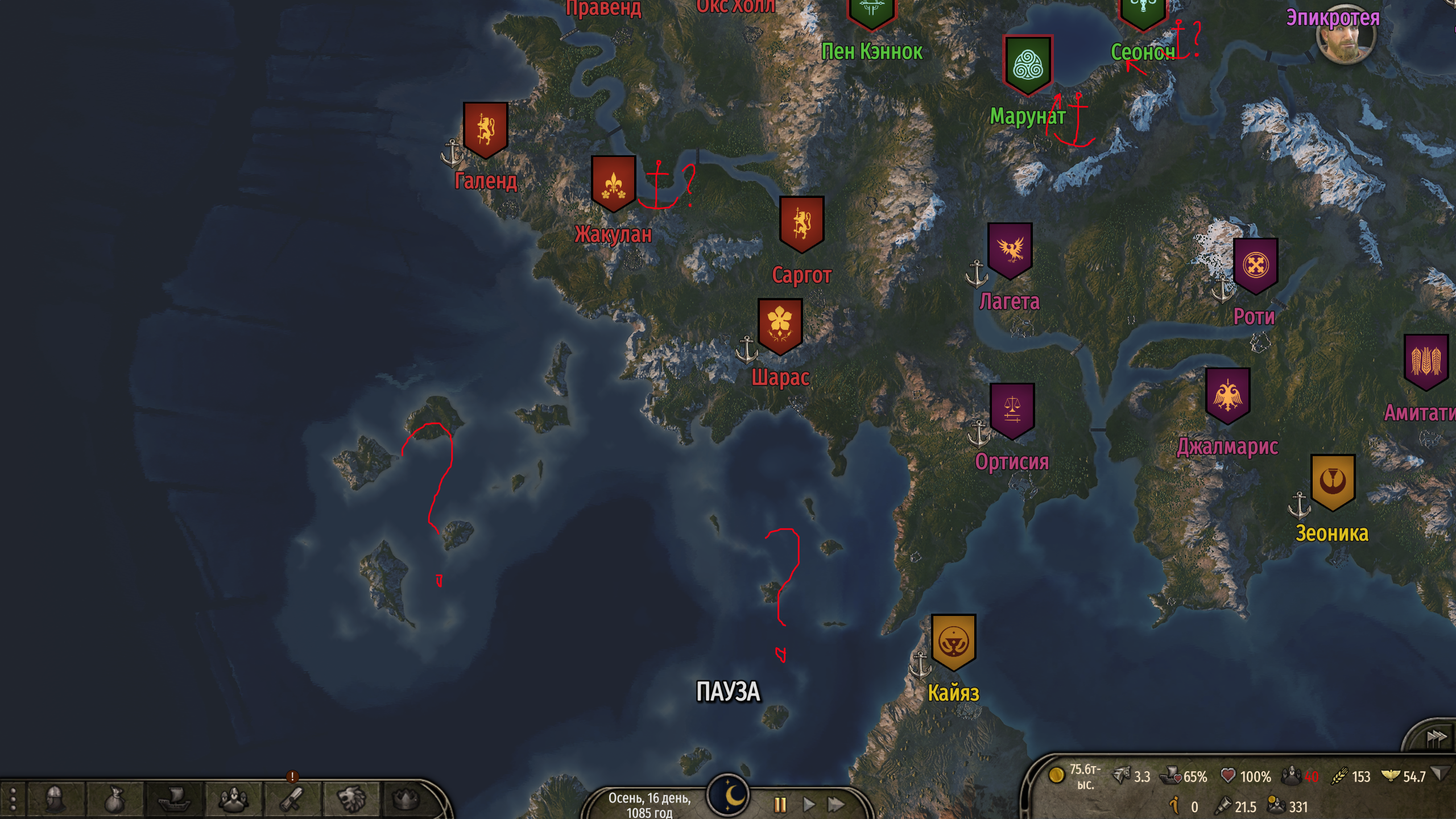 Суканах, заключил союз с Асераями, обезопасил тылы, так ебучие империи мне все объявили войну (в оборонительной войне с Реджией я у нее замок оттяпал). Мыкаюсь со своими пятью сотнями отборных солдат, пытаюсь захватить какой-нибудь прибрежный городок, только будет ли толк, придет две тыщи и отобьёт...но посмотрим. Пока Реджия после моего замка отвлеклась на Асераев, поплыла им замок осаждать, а я под шумок может и оттяпаю чего...