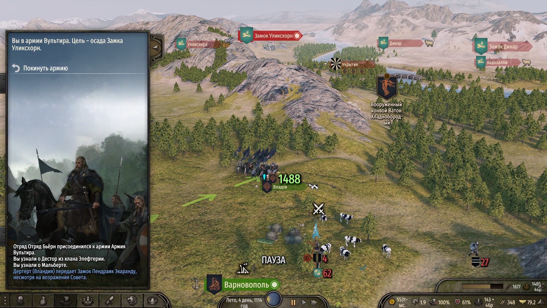 Вот чего мало, так это влияния! После военной компании я остаюсь с нулем, а во время ее приходится свои войска раздавать чтоб не разбежались. Хорошо, что хоть свои отряды бесплатно призываются. Шесть с половиной сотен отборных солдат (конницы только маловато пока) это уже не шутки.