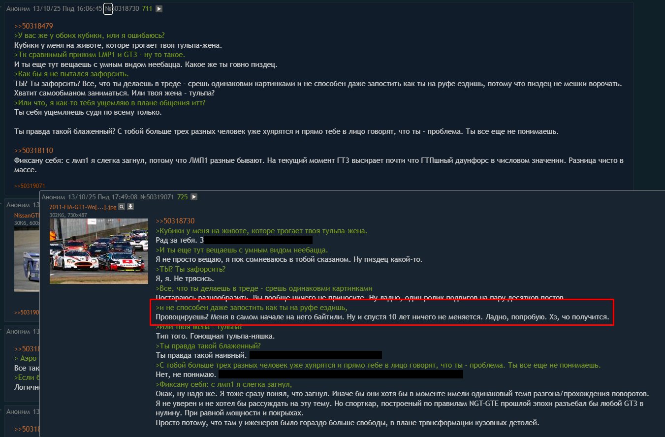 >>50350136 >делают жопу зацепистее И делают машину быстрее на прямых, да? Понял принял. >Религия запрещает? Машина не предназначена для езды без трекшена. Ездить без трекшена это либо терять кучу времени, либо умирать. Это не про скилл, а про абуз движка игры которыый позволяяет так делать. Это выход за рамки нормы. > слишком гуманитарий Мне не нужны икспирименты и бытие техническим гуру чтобы знать, что если я кручу сетап и получаю то, что в других играх невозможно - это не нормально. А еще я очень быстро езжу. Очень быстро. То, что неудачники зовут алиенами. Мне не нужно проводить научные икспирименты чтобы понять от чего машина едет быстре в игрулечке.
