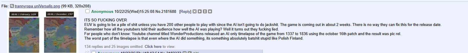 >>50375690 Я в ахуе, каким нужно быть опущеным чмом, чтобы в игры парадоксов играть не на айронмене. Я, конечно, давно знал, что текущее комьюнити этих игр это подпивасные скуфы, вышедшие прямиков из танков. Но чтобы это комьюнити было настолько днищенское даже я не мог подумать.