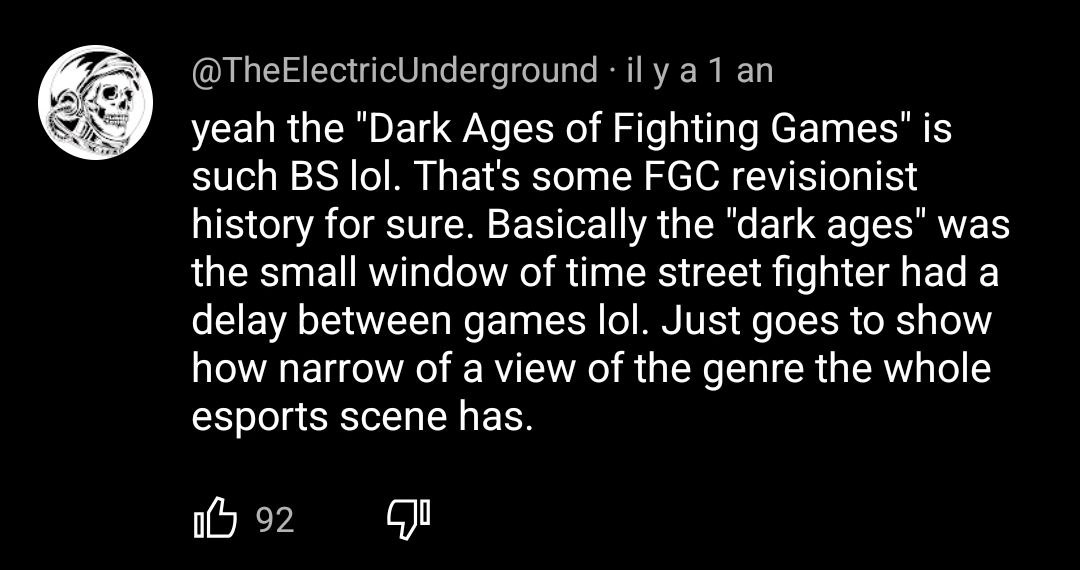 Но нет, давайте обсуждать мыльные полуфиналы Руфуса против Рю на тренировочном стейдже в СФ4, это ведь так важно и интересно. Максимально унылые матчи, где один кидает дайвкики, другой кидает cr. MK, иногда делая EX дп. Нет, спасибо, уж лучше троу лупы (неиронично). И это во время, когда Knee дакал электрики и делал таунт в джет аппер посреди интенсивного мувмента, который сам по себе как произведение искусства. Даже я где-то в то время, мб чуть позже выхода СФ4, посетил локальный турнир по Т6, который был намного интереснее этих американских футси-фестов. Морк правильно написал, что у е-спортсменов неадекватное представление о состоянии жанра в то время. Это странно, учитывая, что они вроде бы играли в консольные файтинги, ВСЕ они восхищаются Т5DR например, мол, какие стейджи, какая музыка, какие персонажи! Но СФ4 важнее, потому что потому. и СФ5 важнее, хоть и посмешище. И СФ6 важнее, потому что ну вы поняли.