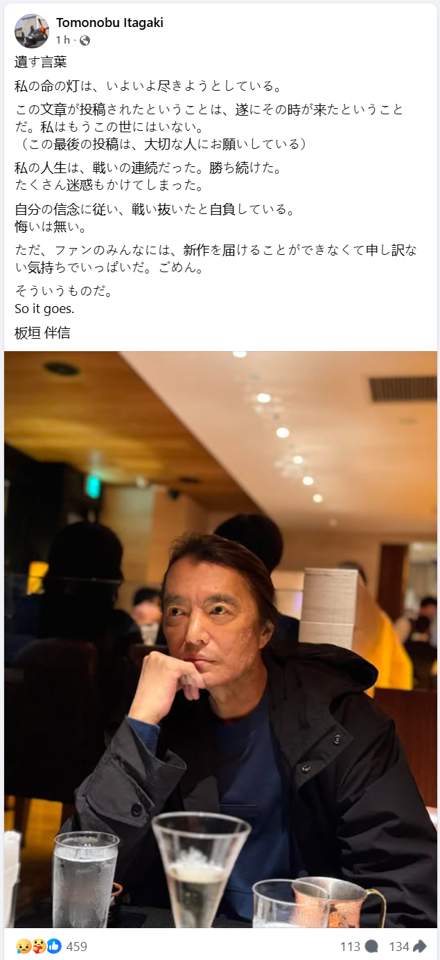 Моя жизнь — это череда битв. Я продолжал побеждать. Я также причинил немало бед. Я горжусь тем, что следовал своим убеждениям и боролся до конца. Я ни о чём не жалею. Однако меня переполняет сожаление, что я не смог подарить новую работу всем своим поклонникам. Простите. Так уж получилось. So it goes. Итагаки Томонобу