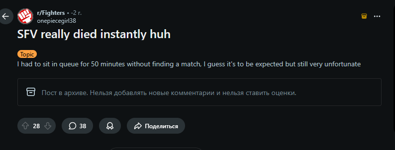 К чему я это? Тут недавно обсуждали разницу между игрой в один файтинг и игрой в несколько. Именно сторонники первого подхода косвенно поспособствовали ситуации, когда весёлые файтинги живут мало, а посредственные живут вечно, потому что они, как американские банки, too big to fail. Это не значит, что СФ6 плох, я думаю это годная игруха, смотреть её точно веселее предыдущих двух. Вполне могу представить Теккен 9 с тремя метрами и анблокабл рейдж артами на 30 секунд, который фгц будет кусать через слёзы просто потому, что там есть Кинг и Казуля