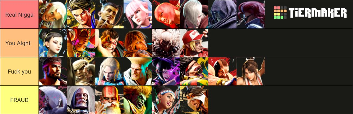 Discord-tier FATAL FURY: City of the Wolves Virtua Fighter 5 R.E.V.O. The King of Fighters XV/XIII/XIV Granblue Fantasy Versus: Rising Tekken 7 UNDER NIGHT IN-BIRTH II Sys:Celes Street Fighter 5 DRAGON BALL FighterZ Melty Blood: Type Lumina Guilty Gear Xrd REV 2/AC+R BlazBlue Centralfiction Skullgirls Samurai Shodown Ultra Street Fighter IV SOULCALIBUR VI Dead or Alive 6 MORTAL KOMBAT 11