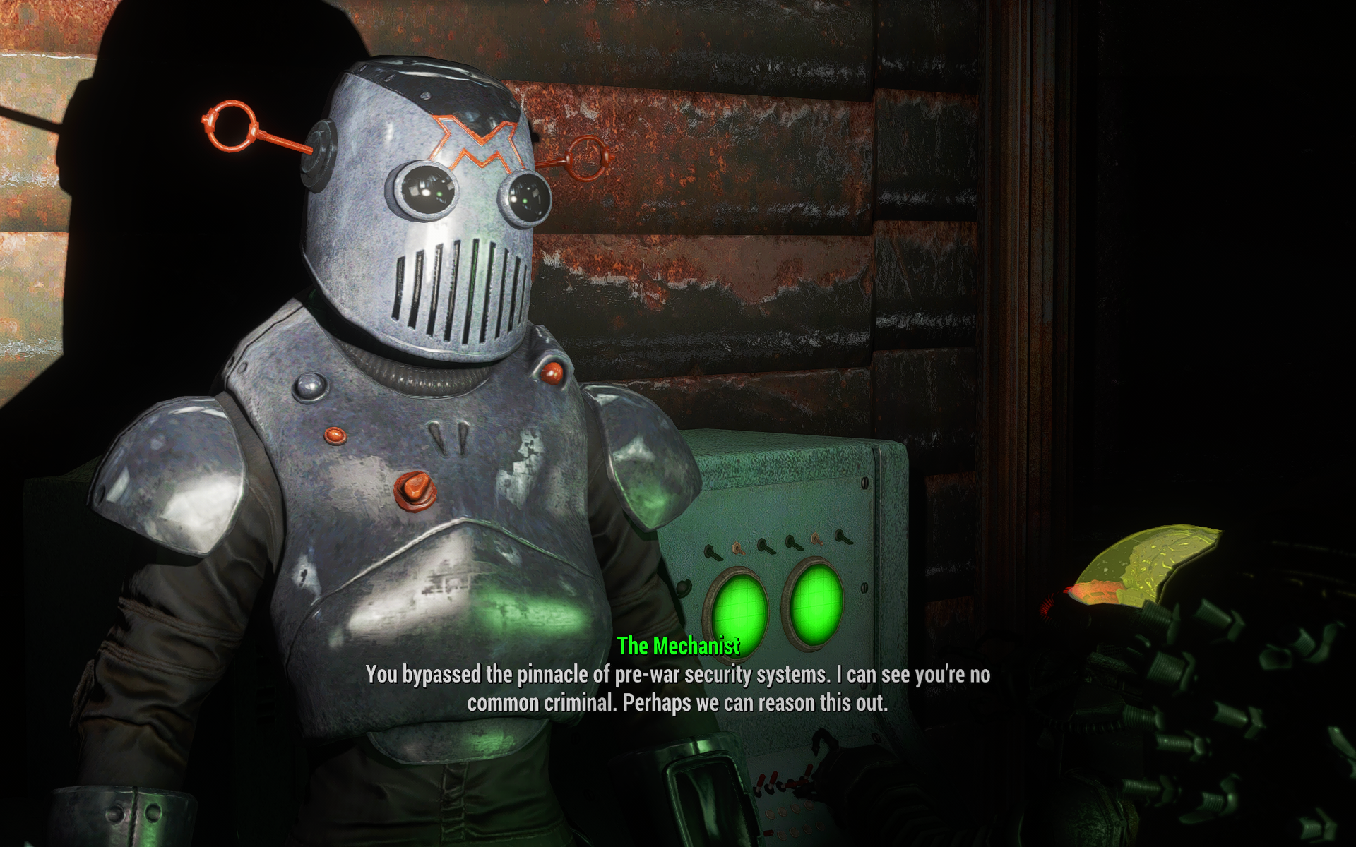 КАКАЯ ЖЕ 4ЛАЧ КРУТАЯ РПГ Хоспаде, это в разы круче вегасомусора и копроизометрии. Я не откровенно вывозила без силовой брони финальную битву с мехаглистом. Благо, что фоллаут 4 -- чистокровная рпг и тут есть много вариантов прохождения квестов. Я решила выбрать вариант с пропуском битвы и сразу перейти к диалогу с мехаглистом. Для этого нужно собрать 3 "отпечатка голоса" в виде голозаписей глав департаментов комплекса, которые разбросаны по всей локации, но найти их не так сложно. После этого вернулась к терминалу в самом начале локи, где инфа про голозаписи и написана. Загрузила в него три кассеты и получила доступ к лифту напрямую в убежище механа. Само собой, что мне пришлось по пути взломать максимально защищенный терминал и замочек (но он опционален), в чем мне помогли Кейт и Ада. Думаю, что не стоит говорить насколько это лучше той кринджовой дырявой хуйни, где ты приносишь создателю диск с очевидными сука фактами о неспособности шреков размножаться, а он как конченый идиот ркнится сразу после этого. Ну про фолач 2 вообще молчу, там мелкая хрень на уровне включить турелли для убийства Хорригона. Механистом оказалась гениальная девочка-подросток, начитавшаяся комиксов про супергероев. С наилучшими намерениями в голове, она создала армию роботов, которые получили директиву защищать людей содружества. Но клише любого сценария про ИИ с неправильной интерпретацией приказа, как обычно, вылилось в гибель многих невинных мирных жителей. Сама Механист была не в курсе и искренне считала себя героем. Стоит ли ее карать за это? Ну я считаю, что однозначно нет. Это как и бы завершение арки Ады, прям как в оригинальной бегущем по лезвию, где финальным этапом обретения человечности стало терпение прощение своего врага, да. Ну и что даст убийство подростка даже не осознающего последствия своих действий до последнего момента? Друзей не воскресить уже никак все равно. Классное длц, не понимаю за что его срут.