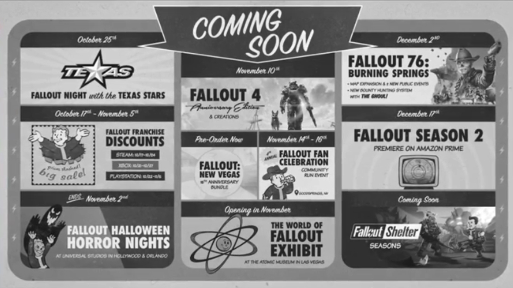 - Следующее обновление будет называться "Burning Springs" (Горящие Источники). Обложка на первом скрине. - Новый регион под названием "Горящие источники", расположенный в Огайо (левая часть Апплачии за рекой). - Центральный хаб для игроков "Highway Town" + 20 новых локаций. - Новая сюжетная линия. - В игре появится тот самый Гуль из сериала (озвучен Уолтером Гоггинсом). - Два новых публичных события с уникальными наградами. - Система "Охоты за наградами" - повторяющиеся квесты с прогрессией по сложности. - Новые оружие, броня, костюмы, легендарные свойства и т.п. - "Нулевая Миля" переедет в новый регион, т.к. в Долине Скайлайн стало небезопасно. Там же появится новый торговец Винди. - Дальнейшее развитие Долины Скайлайн. - Босс "Бродяга" пока откладывается.