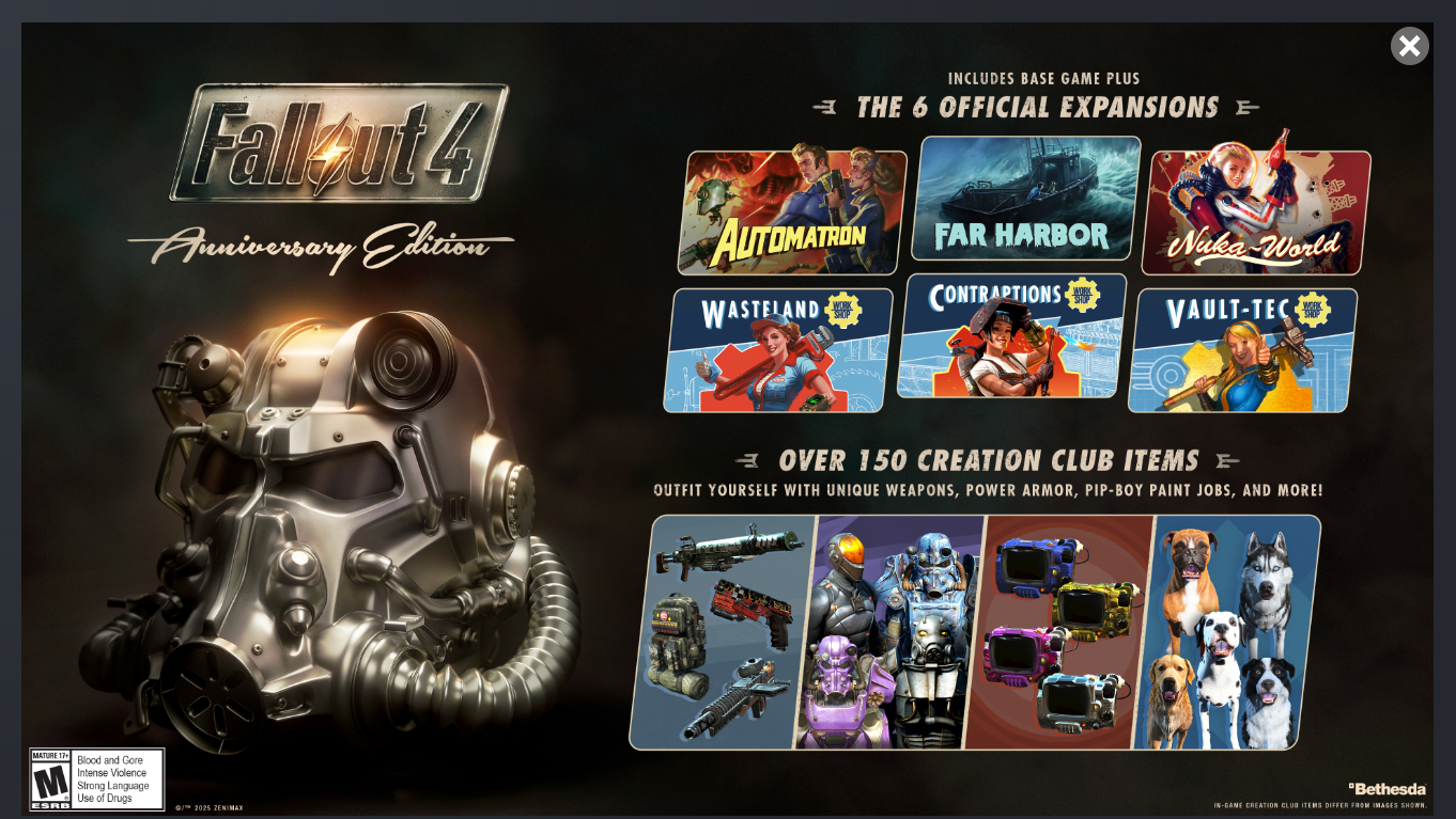 >>50276429 (OP) Через 2 месяца будет юбилей с момента резила четверки - 10 лет.В скайриме в честь этого сделали дополнительное издание с 40 модами и прочим.Интересно будет ли тут нечто подобное?