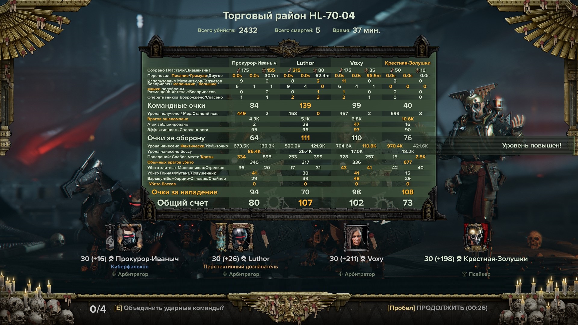 Новости: - Реворк Псайкера, Зилота и Ветерана до уровня Огрина и Арбитра, да, настолько теперь все имбуют; - Новый враг - Скаб Ганнер с плазмой, сносит пол тафны с выстрела, был лютой имбой на релизе и занерфлен через 3 дня хотфиксом; - Две новых ветки и новая карта для режима "Кошмарных Видений" - ветки на игру от критов и контроль толпы с танкованием аля огрин соответственно.