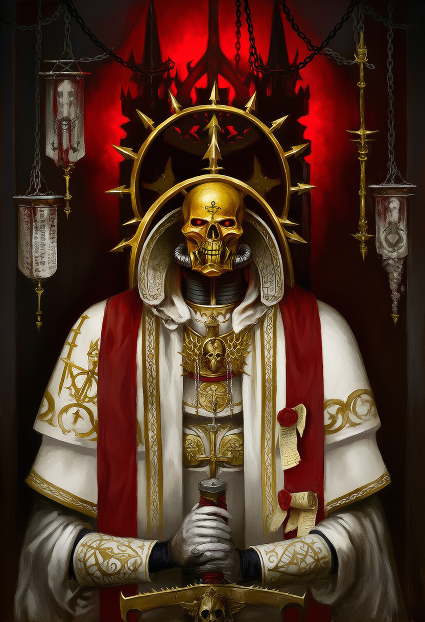 "A grimdark gothic portrait of a Ministorum priest from Warhammer 40k, wearing ornate white and gold ecclesiarchal robes, purity seals, parchment scrolls, golden aquila, gothic relics hanging from chains, burning incense, stern and fanatical expression, cinematic chiaroscuro lighting, painterly oil painting style, official Rogue Trader CRPG character art style."