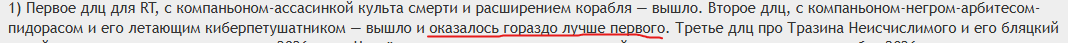 Смотри и вникай. Тассера - годная планета, каноничный феодальный мир с интересным сюжетным твистом с подменой аж два раза. Сами арбитры как фракция переданы хорошо. Новый класс не имба, как танцор смерти\палач связка, но при хорошей сборке показывает приличный урон, да и дробачи мастхев там играют. Захват Бессердечного и его функции по ходу игры тоже отлично вписаны, алсо, если верно говорю, то именно в этом длц тебе дали возможность с собой эскорт кораблей таскать, что тоже на геймплей влияет позитивно. Тема с десятиной, с судом, где судья ты, и судом, где судят уже тебя, что и есть основной твист дополнения кроме брата теодоры и ее задумок на десятину сами по себе довольно захватывающие. Новый напарник - ну ИМХО слабоват в плане характера, если сравнивать с напарниками из основы, типа деда Абеляра, аристократички Кассии, монашки Аргентины. Хотя... Как чисто служебный Глухарь он прописан неплохо. Пидорская темка спокойно игнорируется, хотя признаюсь, стыд испытывал от некоторых функций в диалоге. Ну это видать для пидорасов эти строчки и писались (или жирух), чтоб охваты чутка поднять. В целом ДЛЦшка то неплохая. А что, кроме гомонегра, не понравилось тебе, и почему?