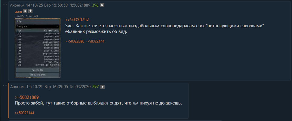 >>50322166 >пук >>50322191 >среньк По делу то есть что сказать? У совков все хуевое в угоду псевдоброни, но даже если ты от пизды стреляешь ему в лоб, то случайно попадешь в нлд/огромный триплекс/маску и убьешь/выбьешь и он уже не сьебется. А если вдруг на 1 градус борт показал, то вся броня делится на ноль.