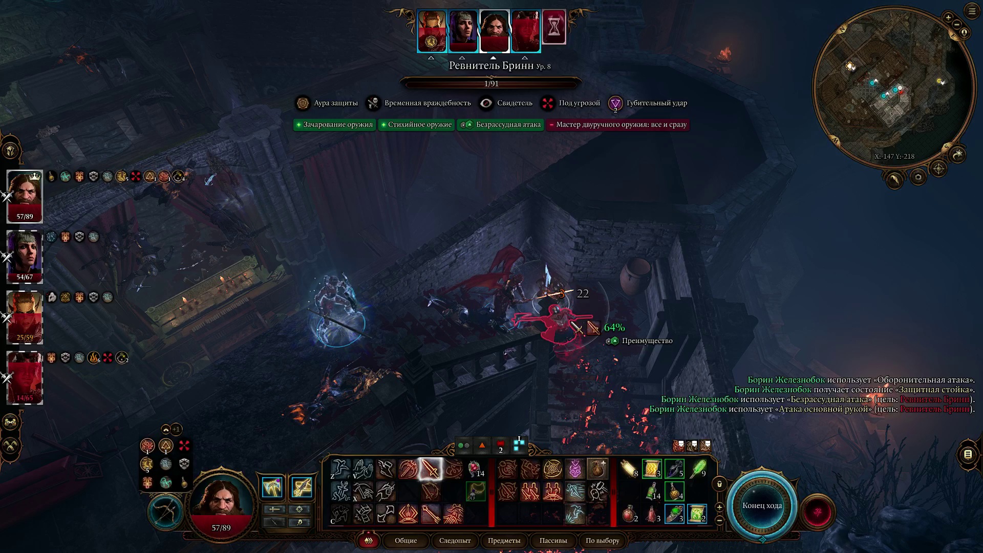 Через ход Тав сбивает концентрацию у культиста на Хадаре, в котором застряли все идиоты-арфисты, они толпой в 5-6 рыл окружают сбитого с ног багбера и в духе сцены "За дозор" запыривают его дамагом по 7-9 хп за 2 хода. Культист-маг словив "тишину" от магических перчаток Минтары, прыгает прямо в эту толпу, дает посохом по морде арфисту и повторяет судьбу багбера.
