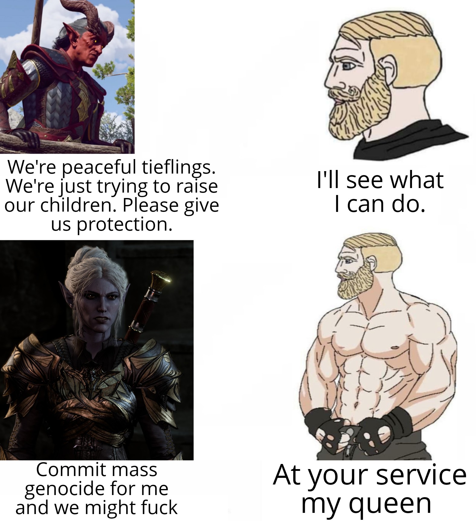 >>50422608 Ну моя вайфу Шадуха, мне про неё контента навалили даже чересчур, пол второго акта с ней связано да ещё и в третьем докинули. А поклонникам Карлах да, не завидую, меня этот персонаж дичайше бесит, но всё равно обратил внимание, что как-то нихрена по ней. Но я думал, это потому что я с ней разговоров много не веду и игнорю по кулдауну. Тинейджерка орущая "йоло" и "фак", мне даже в школе или универе подобные не нравились. Обычно были переёбаны половиной общежития, потому как давали всем подряд- просто от широкой души и доброты.