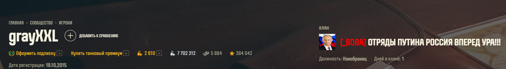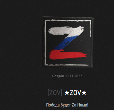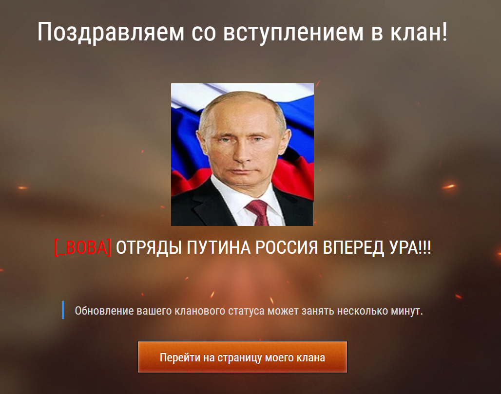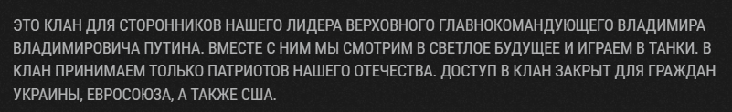 ЭТО КЛАН ДЛЯ СТОРОННИКОВ НАШЕГО ЛИДЕРА ВЕРХОВНОГО ГЛАВНОКОМАНДУЮЩЕГО ВЛАДИМИРА ВЛАДИМИРОВИЧА ПУТИНА. ВМЕСТЕ С НИМ МЫ СМОТРИМ В СВЕТЛОЕ БУДУЩЕЕ И ИГРАЕМ В ТАНКИ. В КЛАН ПРИНИМАЕМ ТОЛЬКО ПАТРИОТОВ НАШЕГО ОТЕЧЕСТВА. ДОСТУП В КЛАН ЗАКРЫТ ДЛЯ ГРАЖДАН УКРАИНЫ, ЕВРОСОЮЗА, А ТАКЖЕ СШа.