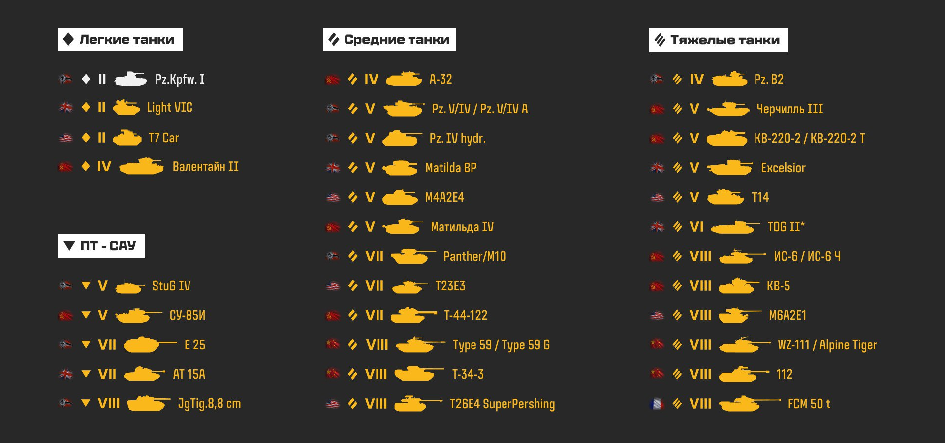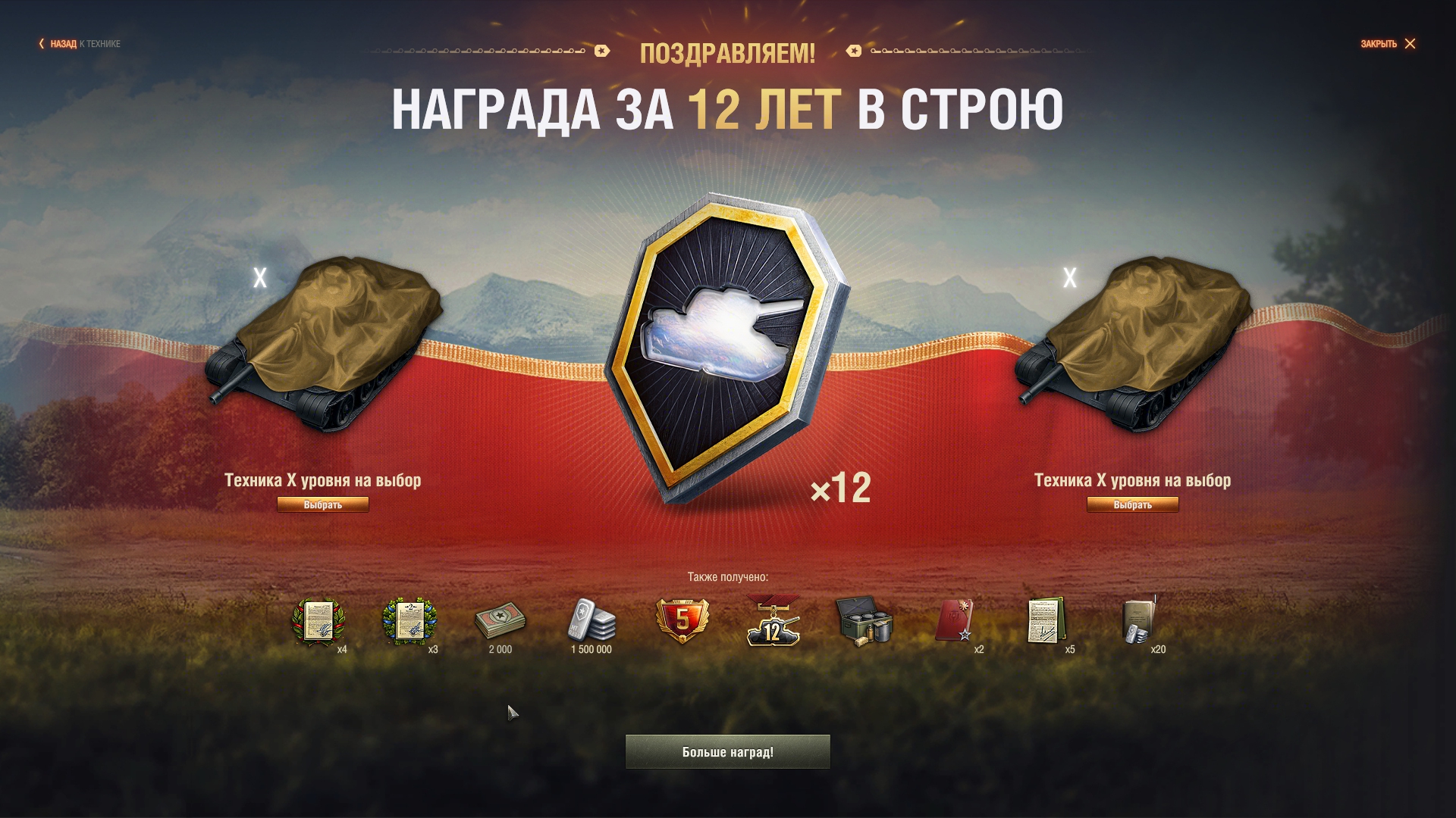 • 4 бланка ЛБЗ для первой кампании. • 3 бланка ЛБЗ второй кампании. 💥 Прокачиваемый танк 10 уровня (кроме Штурм-САУ) на выбор игрока (1-5 лет регистрации) 💥 И два прокачиваемых танка 10 уровня для 5+ лет регистрации!