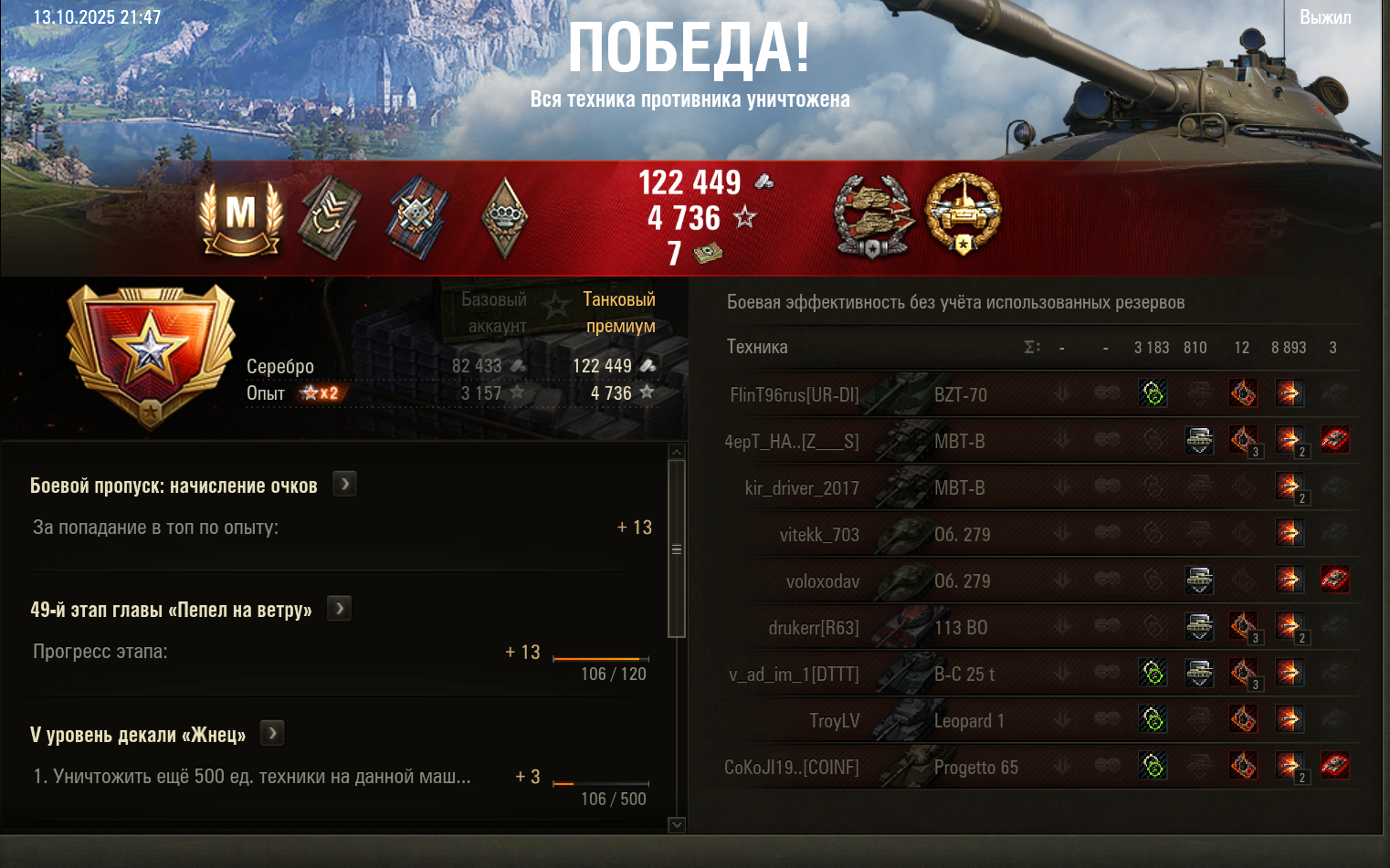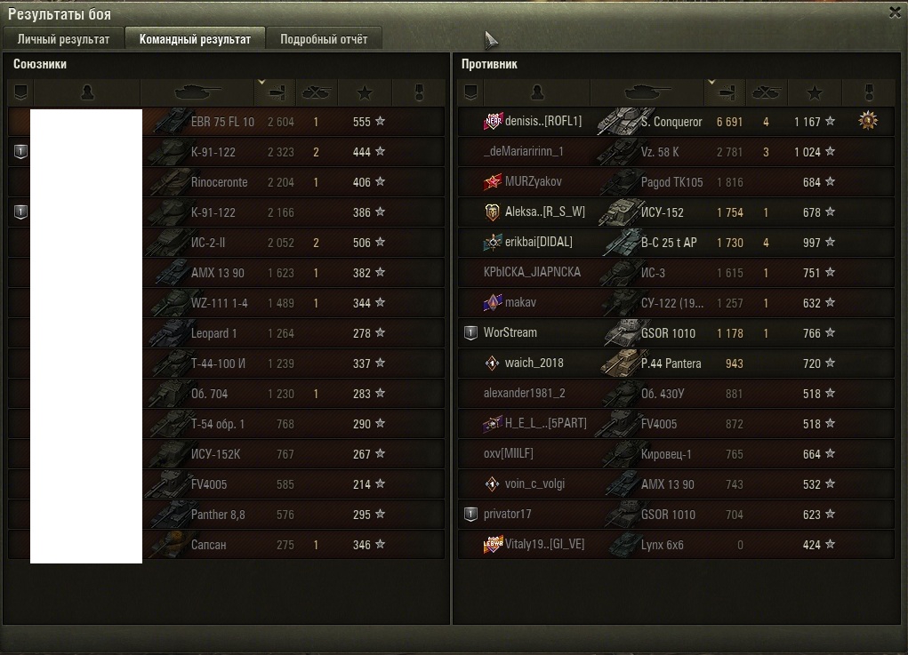 >>50321066 Так я почти весь бой фуловый оставался, носился только туда сюда, от их базы к своей и обратно, повторить. Под конец обосрался в ущелье, верхнего респа на МБТБ выкатился, думал ща как борт ему подставлю, а мой 279 не поворачивает (вязкие грунты). Ну, он мне на всю котлету и въебал в лоб. Благо союзный Немезис помог, и добил шотного, а то бы он раньше меня перезарядился. Да понятно, маленький результат для статиста, но огромный для лехи вроде меня с 2к урона на топах.