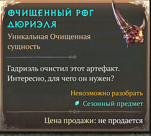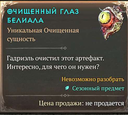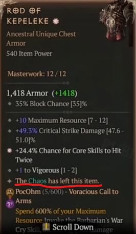 Далее идут уникальные, мифические и появившиеся только в этом сезоне хаотические вещи. Уникальные вещи отличаются изначально заданным набором аффиксов, которые могут случайно рандомизироваться только в количественном плане (если допускается случайное значение, к примеру, 20-40%) и уникальным аффиксом, который нельзя извлечь. Как и у всех в этой группе дополнительных аффиксов им выдать нельзя, а заточка доступна сразу. У самых редких, мифических вещей, даже числовой разброс параметров отсутствует. Ну а хаотические вещи - это по сути такие же уникальные, но принимающие облик другого предмета, к примеру, уникальный посох может иметь вид шлема и вставляться в соответствующий слот. К тому же, эффективность уникального аспекта в таких вещах всегда максимальная и превышает максимум обычной уникальной вещи примерно на 25%.