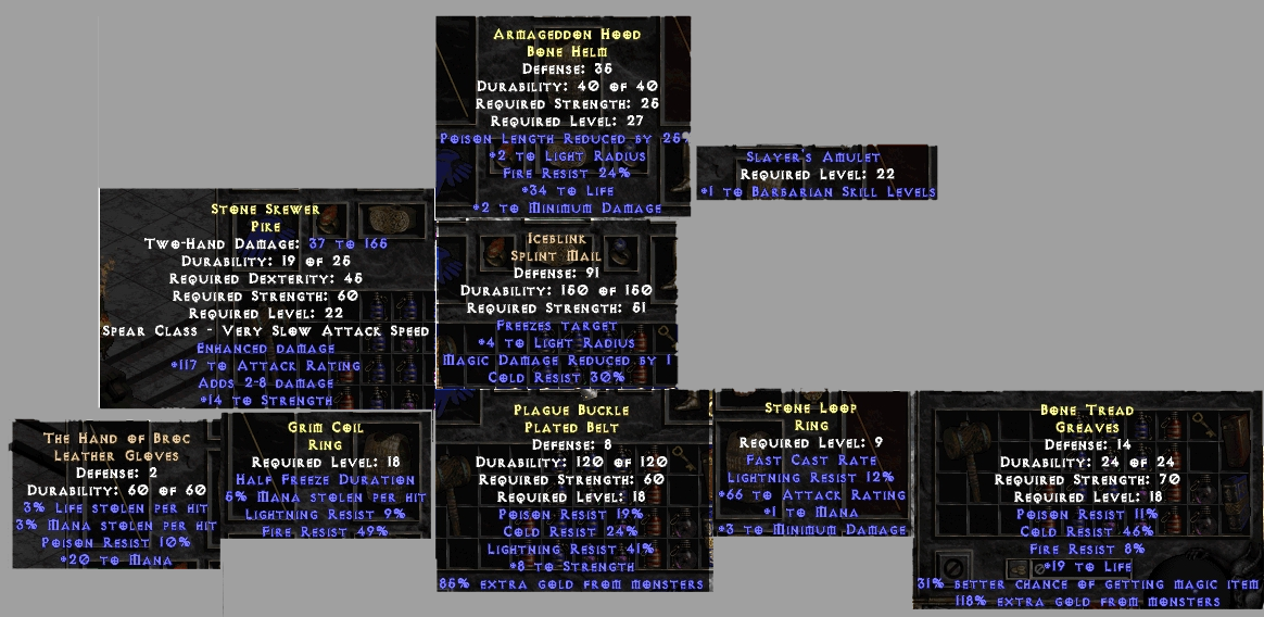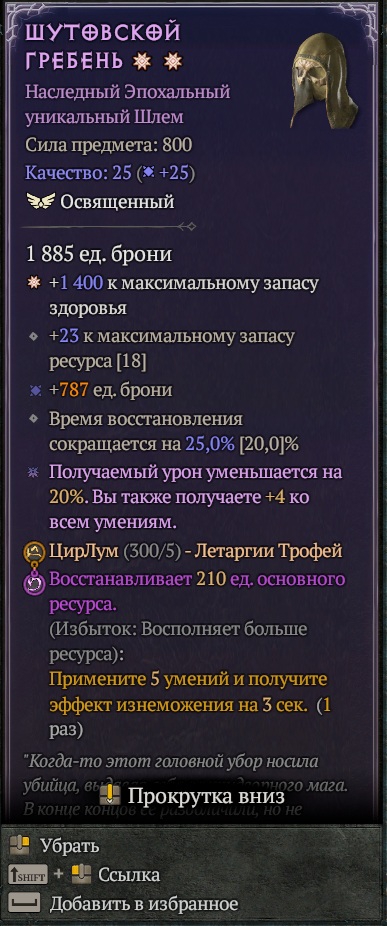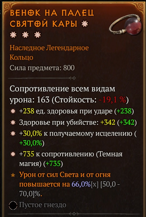 Стоит отдельно выделить вещи предков, они же вещи 800 уровня, они же вещи со звездой, они же вещи с ГА. Это усиленные версии легендарных, уникальных, мифических и хаотических предметов, которые могут иметь 1-3 (для легендарных), 1-4 (для остальных), максимизированных аффикса (опять же, выше предела стандартной шмотки где-то на 25%). В описании вещи выделяются такие аффиксы звёздами. В случае легендарных вещей, чем больше звёзд на вещи, тем больше шансов реролла дополнительных аффиксов у кузнеца. У мифических и хаотических шмоток как минимум 1 звезда всегда присутствует изначально.