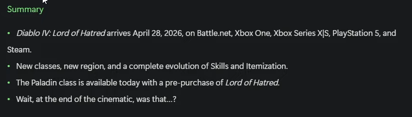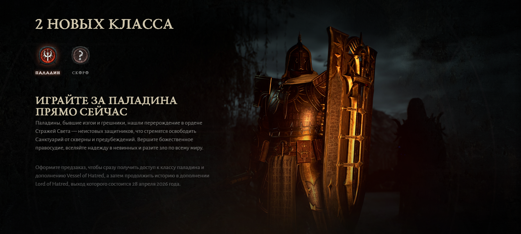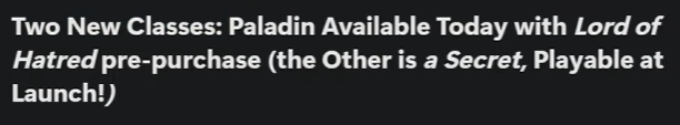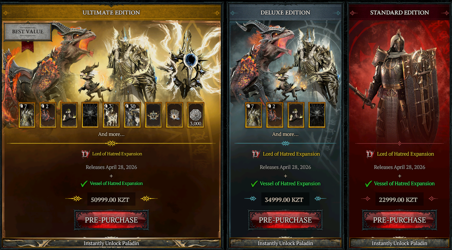 >>50599485 В данный момент есть базовая игра + 1ое дополнение Vessel of Hatred (вышло год назад) + предзаказ второго дополнения Lord of Hatred (выйдет 28 апреля 2026г). Те, кто уже сейчас предзаказал 2ое дополнение, имеют возможность прямо сейчас играть за новый класс из него - Паладина.