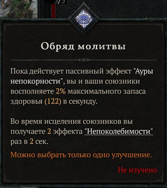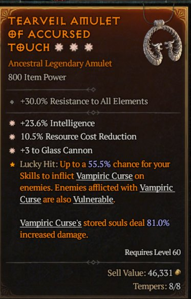 Также у редких и легендарных вещей есть возможность добавления двух дополнительных аффиксов, которые, как и аспекты делятся на группы: оружейные, атакующие, защитные, поддержки и подвижности, в каждой группе ещё несколько подгрупп, стандартные и классовые, в каждой подгруппе 3-5 вариантов аффиксов. Появляются они после подбора соответствующего рецепта для кузнеца в качестве дропа с элитных мобов в поздней игре и за выполнение заданий дерева, имеют 3 уровня прокачки - синий, жёлтый и оранжевый, последние 2 начинают, как правило,падать, когда ты уже собрал все рецепты предыдущего уровня. У каждой вещи ограниченное количество рероллов таких афиксов, которое указывается во время добавления, так что тут именно тот момент, когда можно угробить хорошую шмотку. Можно однократно сбросить счётчик количества попыток с помощью свитка восстановления, которые иногда дропаются на сложности т1-т4 и за прохождения Тёмной цитадели.