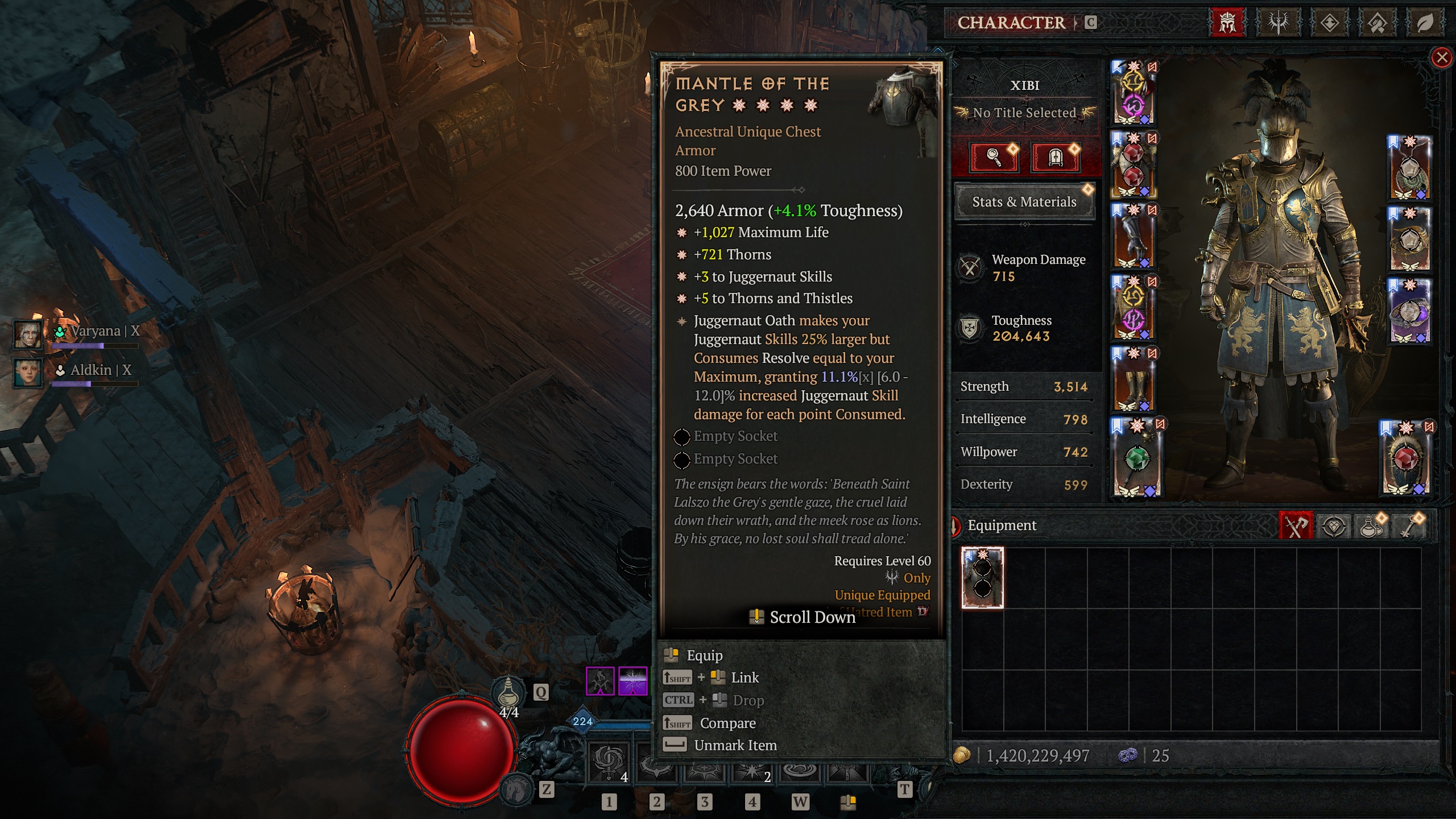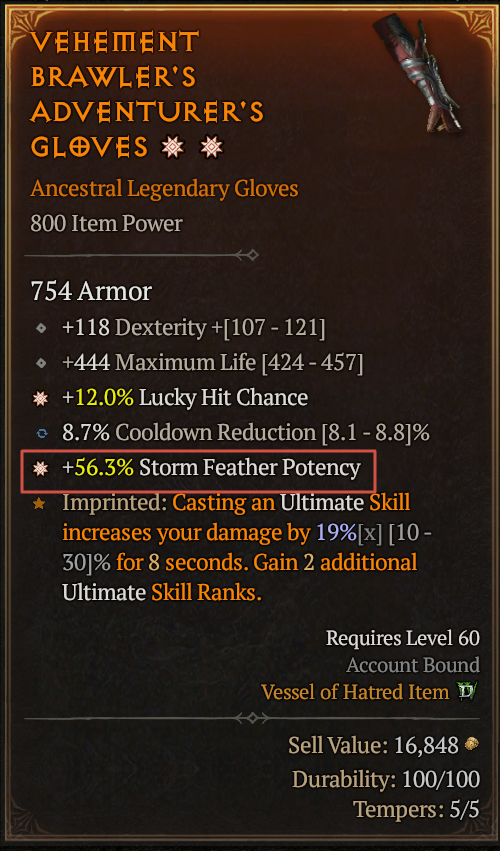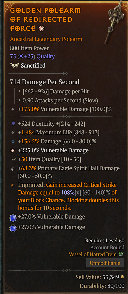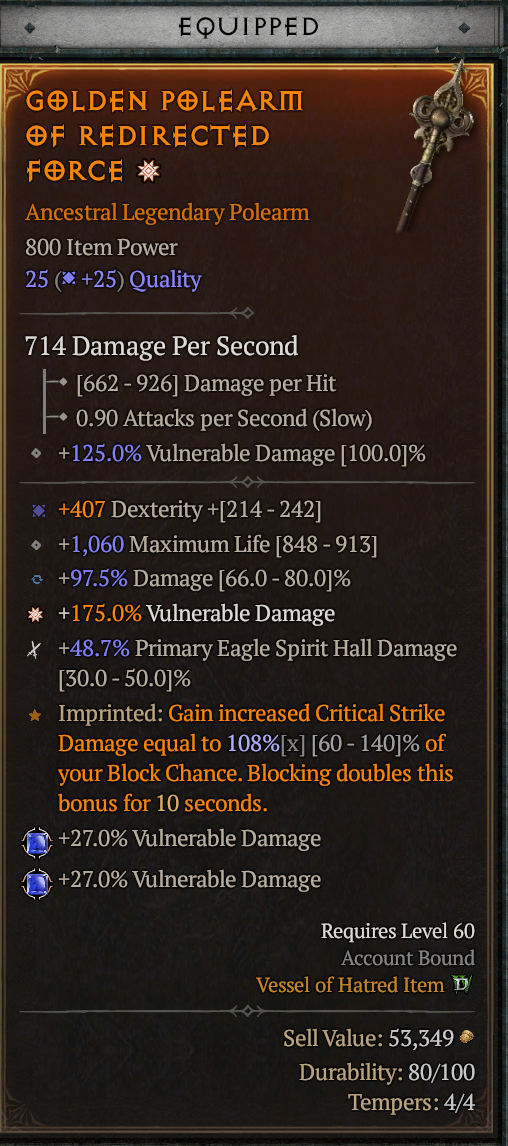 >>50310649 Теперь о "реальной" жизни. В начале игры достаточно просто ориентировать по урону/характеристикам вещи, что лучше, то и носишь на себе. в эндгейме ориентируешься по параметрам, если хотя бы 2 в легендарной шмотке лучше, чем те, которые у твоей, или больше подходят билду, идёшь к кузнецу и пытаешься нароллить 2 нужны аффикса, желательно с приближенными к максимальным значениями. Если удалось - идёшь перероллить 3-й параметр на вещи, после этого заменяешь аспект на нужный, возвращаешься к кузнецу и точишь до тех пор, пока хотя бы 2 рандомных заточки не попали в максимально эффективный для билда аффикс.