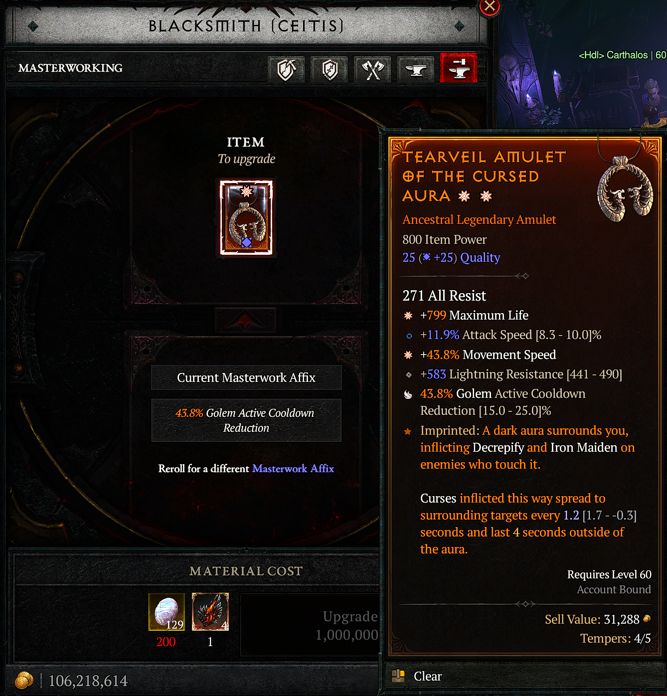 После того, как оба дополнительных аффикса добавлены, открывается возможность заточки вещи (последняя вкладка у кузнеца). Максимальный уровень заточки для вещей 750 и ниже уровня - 8, для 800 - 12. Первые 3 уровня растут все аффиксы вещи с числовым значением, на 4-ом один случайны аффикс усиливается на 25%. На остальных уровнях аналогично. Вот тут неудачную заточку можно сбрасывать сколько угодно раз, но стоит удовольствие дорого - 5 млн. золота и ресурсы. Как правило, все игроки стараются выбрать какой-то один аффикс, главный для своего билда и пытаться заточить вещь до тех пор, пока все 3 рандомных улучшения на 4, 8 и 12 уровнях не попадут в один и тот же аффикс.