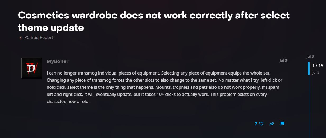 Чета игорь все таки халтура. Переключение скинов на пушки и мауна действительно заработало с вудуистской комбинацией: >Yeah the bug is still in effect for me also. For some odd reason Holding left click, pressing Mouse 5 and releasing Mouse 5, then releasing left click allows me to select options in the wardrobe. It still will force the whole outfit theme, but at least you can select portals and pets with that combination. Happy Hunting! Но выбрать скин на отдельную шмотку так и не могу, только на весь набор сразу. И учитывая что это с июня посты, чета я пиздец как сомневаюсь что это собираются чинить в ближайшее время. Лаги периодические до сих пор. До сих пор иногда персонаж типа бежит на месте, потому что все залагало к хуям. Особенно приятно на ивентах с гоблинами, и на хк офкрс (соболезную). В пое уже как полгода все починили, сервера работают идеально просто, а тут в 5 раз ниже онлайн и лагаает. Заебись, спасибо трансам на кодерах из близзов.