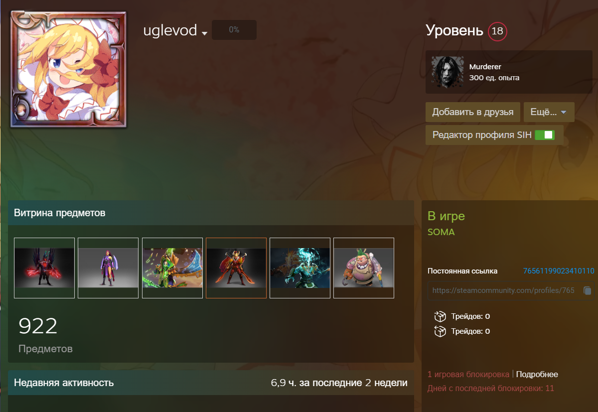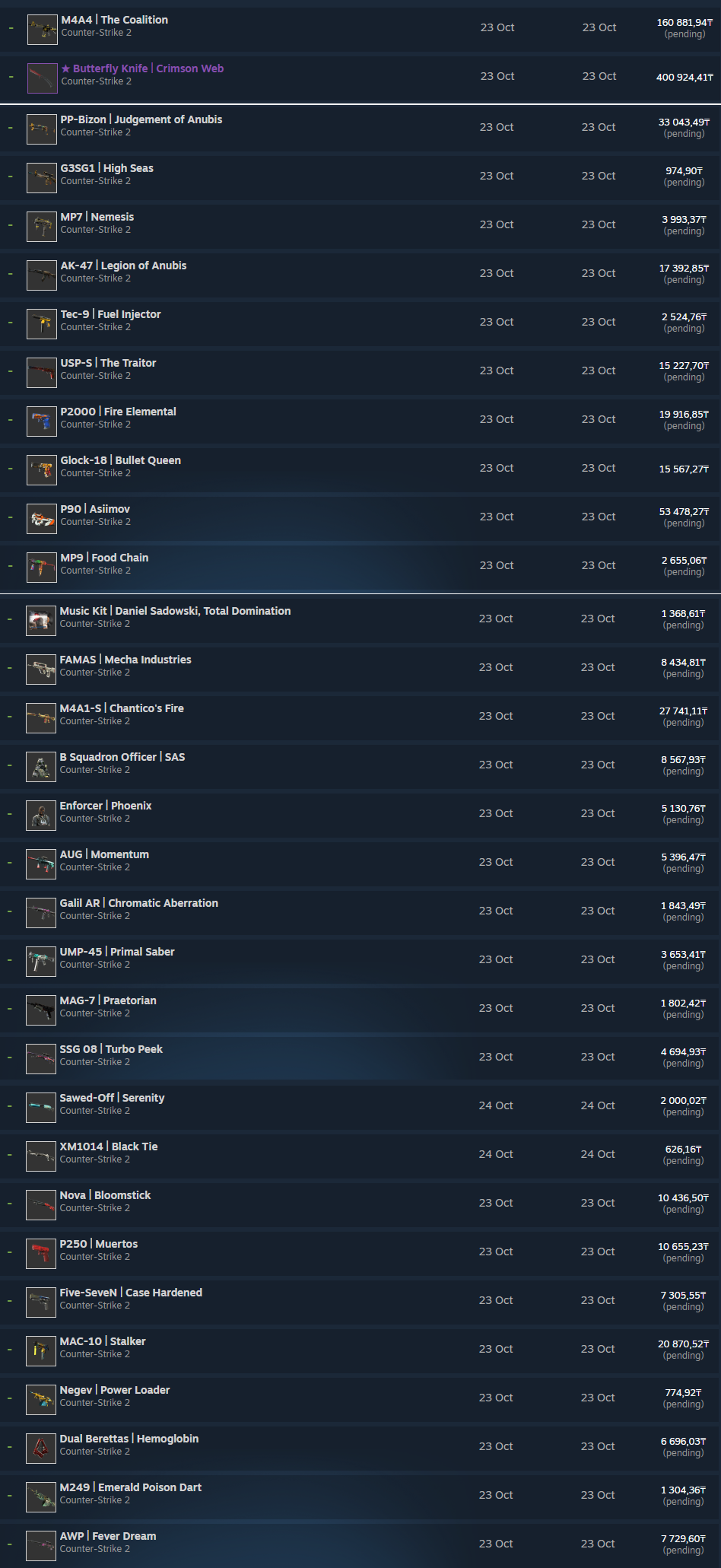 Не играю в эту парашу уже лет 5, инвент пылился примерно столько же (остались самые старые и любимые скины для памяти), итоговый навар под 30к, спасибо моему кенту за срочный звоночек. Габену спасибо, кенту спасибо. Теперь эта страница жизни может быть забыта во всех смыслах