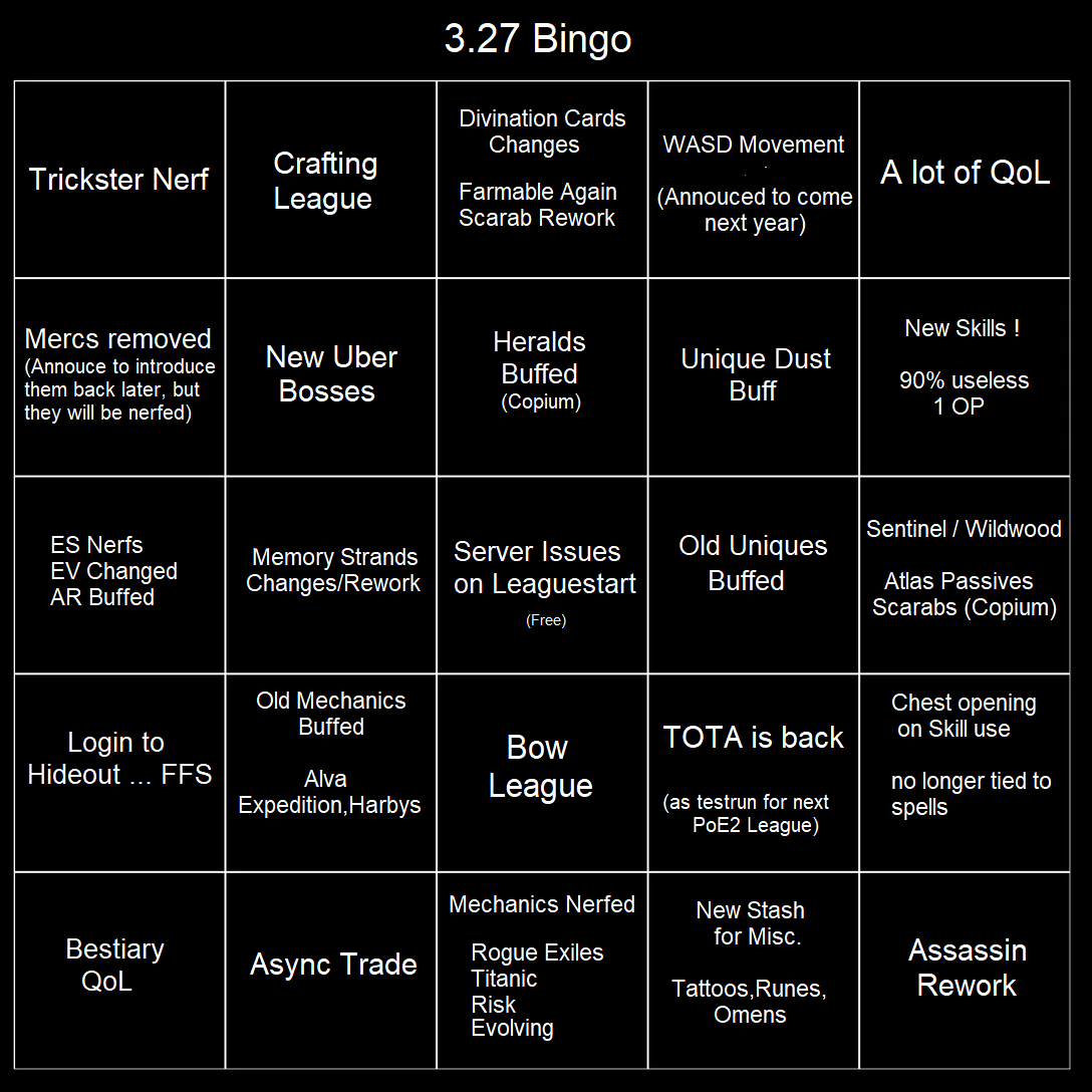 ребят я механику придумал для пое кредиторы короче что бы в кал гуре был ростовщик и ты мог у него взять 10 бошек и через две недели вернуть 20 если не сможешь то тебе прям в ХО будут приходить убер наемники и шотать тебя типо они тебя изобъют обосут и рандомную шмотку прям с твоего гира снимут и со стэша что нибудь своруют и скажут что долг еще в силе ну как вам идея?