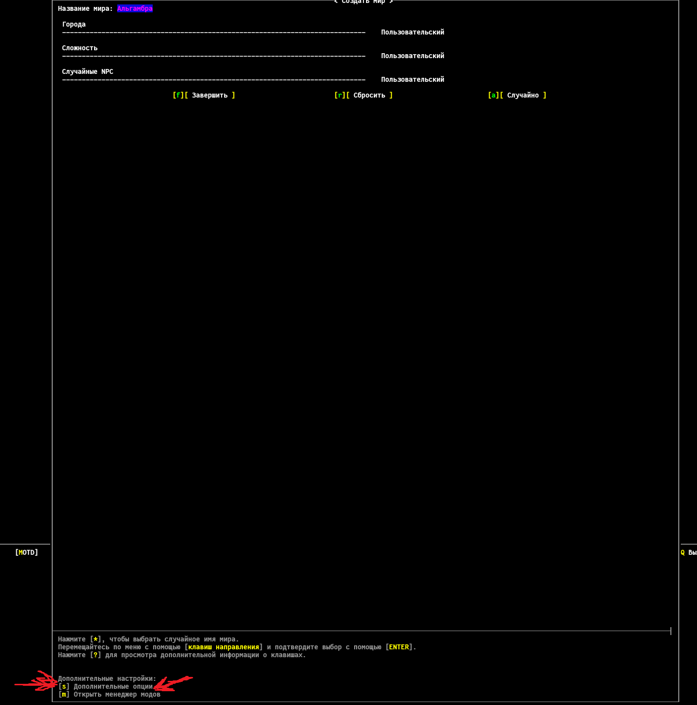 Платиновые вопросы: • Русек вшит в игру, язык меняется в настройках. • В окне создания мира вкладки переключаются кнопками < и > с шифтом в английской раскладке, моды переключаются Tab и Shift+Tab. • Чтобы поднять часть предметов из кучи - выбрать предмет, набрать цифрами необходимое количество и нажать кнопку "стрелка вправо". • А как...?///Любой вопрос по управлению: Нажать Esc, далее выбрать Keybindings и найти нужный хоткей. Если вопрос более сложный, нажать Esc/помощь или ? и внимательно все просмотреть.