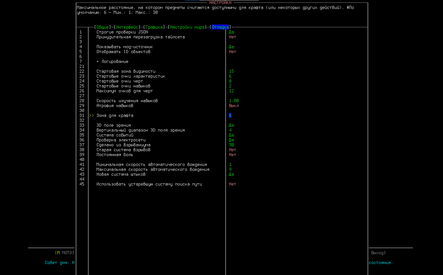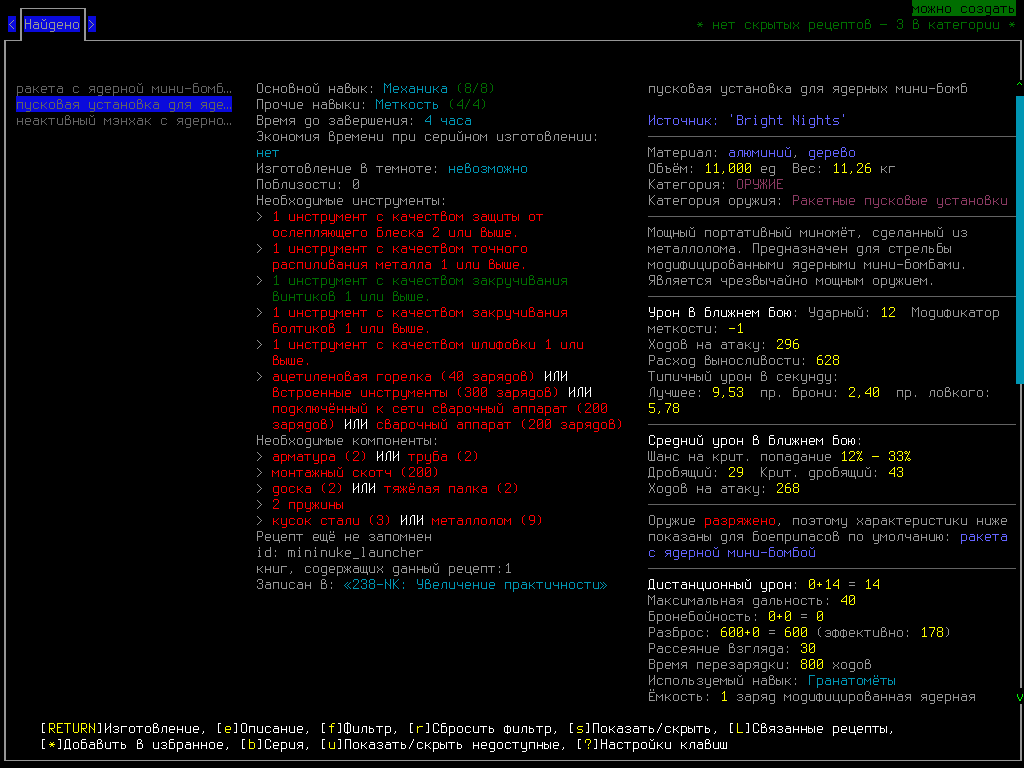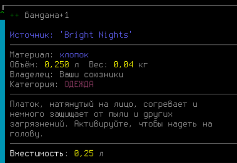Я больше не занимаюсь этой игрой или какими-либо её форками, включая CDDA, Bright Nights и другими. Я не выполняю техническое обслуживание или обновления ни для модов, ни для модпаков. Однако я всё ещё постараюсь помогать другим на своём личном сервере и на сервере Bright Nights с их вопросами, давать объяснения и мотивацию, как исправить JSON, чтобы моды снова заработали.
