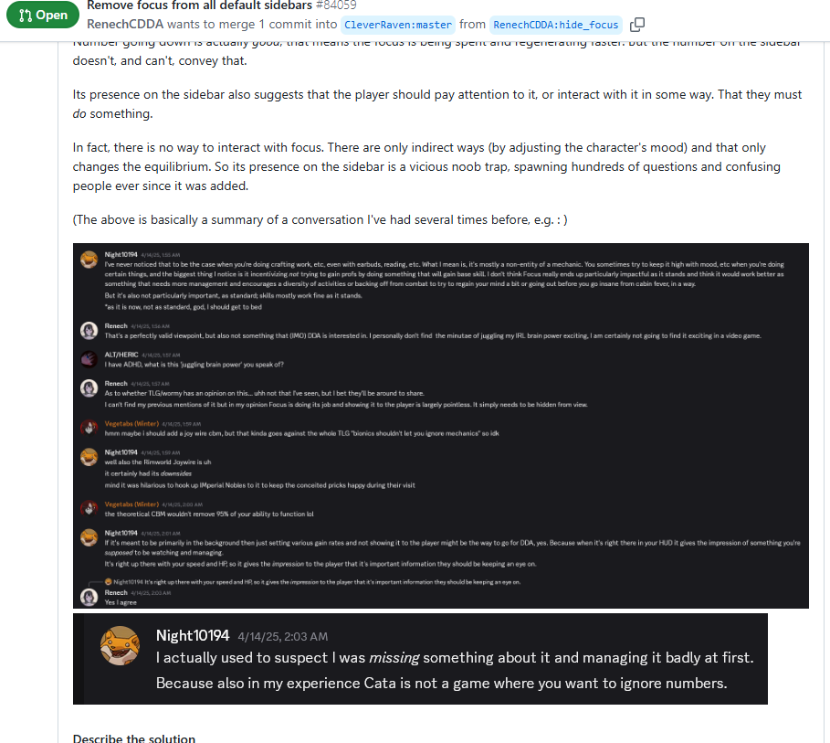 ай в пизду вообще этих ебанатов, можно спокойно играть в старые версии и всё, один хуй они ничего толкового в новых не добавляют. "Нуб трап создающий сотни вопросов" да ахуенно, в игру же столько новичков каждый день залетают и все вопросы только о том как фокус работает, а не о том как их ебучая броня калькулируется и т.д. Ну и когда при низком невидимом фокусе перс будет хуёво действовать это конечно сотни вопросов АПОЧЕМУТАК не вызовет да. Ну и ирл эти педики видимо не ощущают когда они не сфокусированы и плохо сосредотачиваются, а ощущают только фурри хвост с вибро пробкой в жопе. Ещё чёта там про римворлд вякают до которого им как до луны в плане юзабилити
