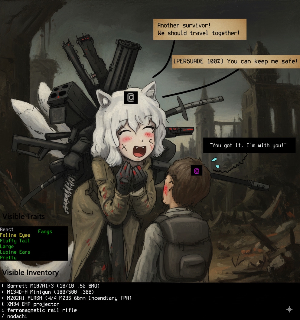 Пока все трясутся с разноцветных флагов, меня смущает больше то что теперь есть мод на мутации которые тебя превращают в... монстродевочек. Вот на пример: появились среди врагов элитные учённые, которые могут поднять радиацию в твоём теле. И мой персонаж из-за радиации получил мутацию, частично только начал превращаться в корово-девочку. Это задевает меня, правильно сказать задевает мои фетиши. Ладно...